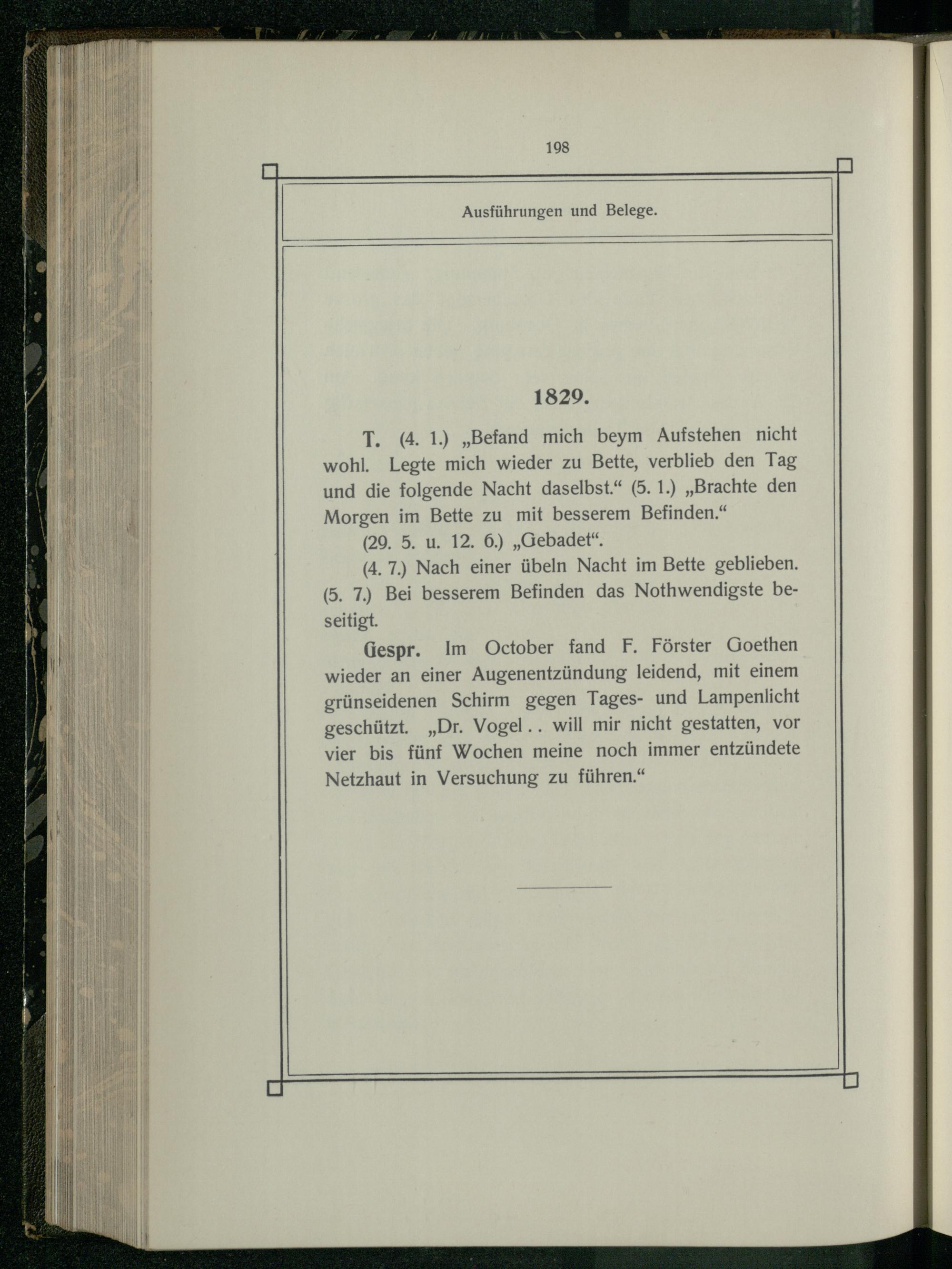 Gespr. Im October fand F. Förster Goethen wieder an einer Augenentzündung leidend, mit einem grünseidenen Schirm gegen Tages- und Lampenlicht geschützt.„Dr. Vogel.. will mir nicht gestatten, vor vier bis fünf Wochen meine noch immer entzündete Netzhaut in Versuchung zu führen.“
