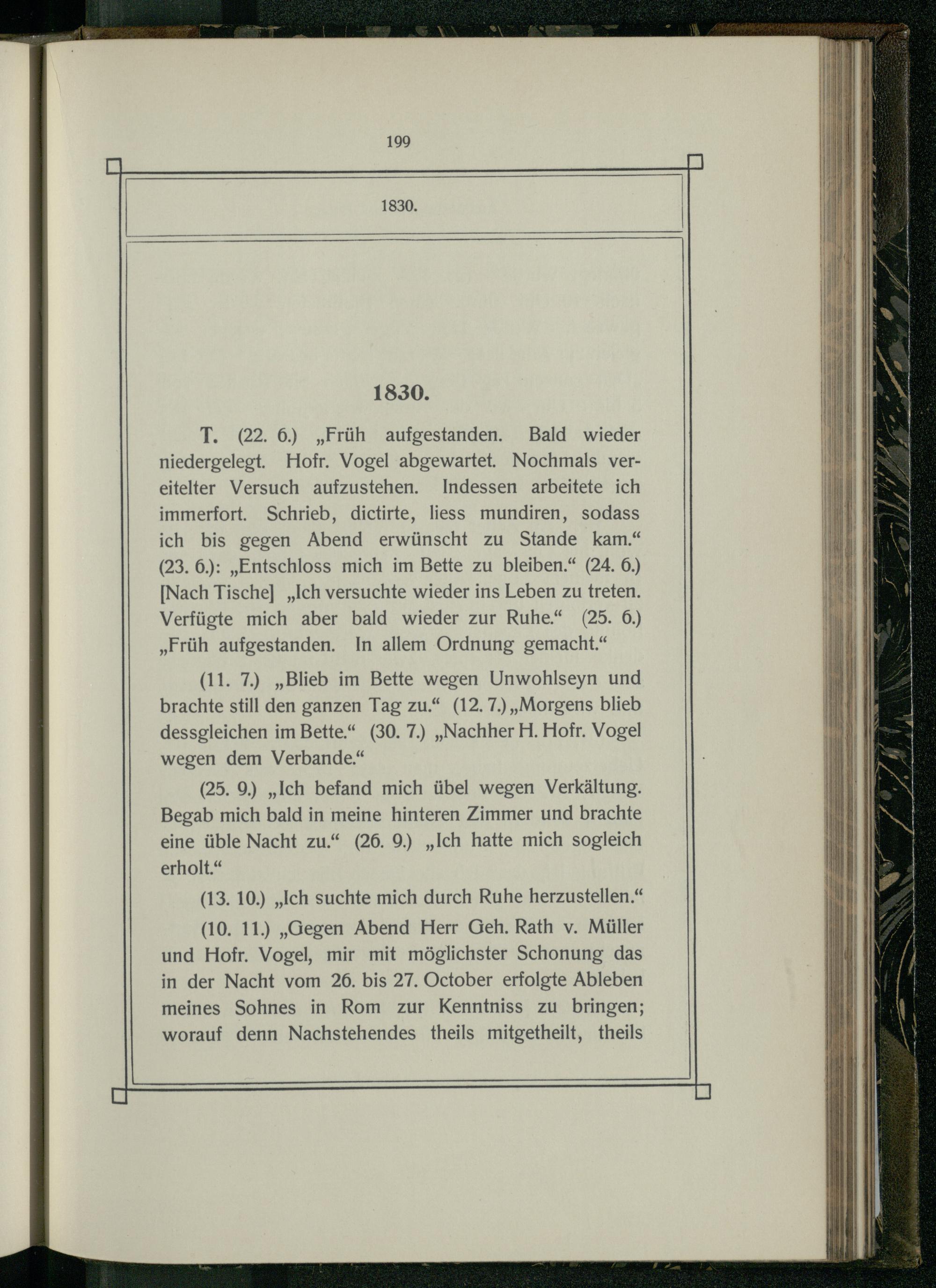T.(22. 6.)„Früh aufgestanden. Bald wieder niedergelegt. Hofr. Vogel abgewartet. Nochmals vereitelter Versuch aufzustehen. Indessen arbeitete ich immerfort. Schrieb, dictirte, liess mundiren, sodass ich bis gegen Abend erwünscht zu Stande kam.“ (23. 6.):„Entschloss mich im Bette zu bleiben.“(24. 6.) [Nach Tische]„Ich versuchte wieder ins Leben zu treten. Verfügte mich aber bald wieder zur Ruhe.“(25. 6.) „Früh aufgestanden. In allem Ordnung gemacht.“