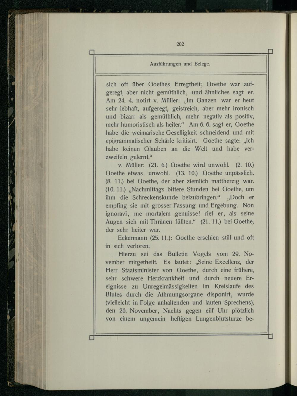 sich oft über Goethes Erregtheit; Goethe war aufgeregt, aber nicht gemüthlich, und ähnliches sagt er. Am 24. 4. notirt v. Müller:„Im Ganzen war er heut sehr lebhaft, aufgeregt, geistreich, aber mehr ironisch und bizarr als gemüthlich, mehr negativ als positiv, mehr humoristisch als heiter.“ Am 6. 6. sagt er, Goethe habe die weimarische Geselligkeit schneidend und mit epigrammatischer Schärfe kritisirt. Goethe sagte:„Ich habe keinen Glauben an die Welt und habe verzweifeln gelernt.“