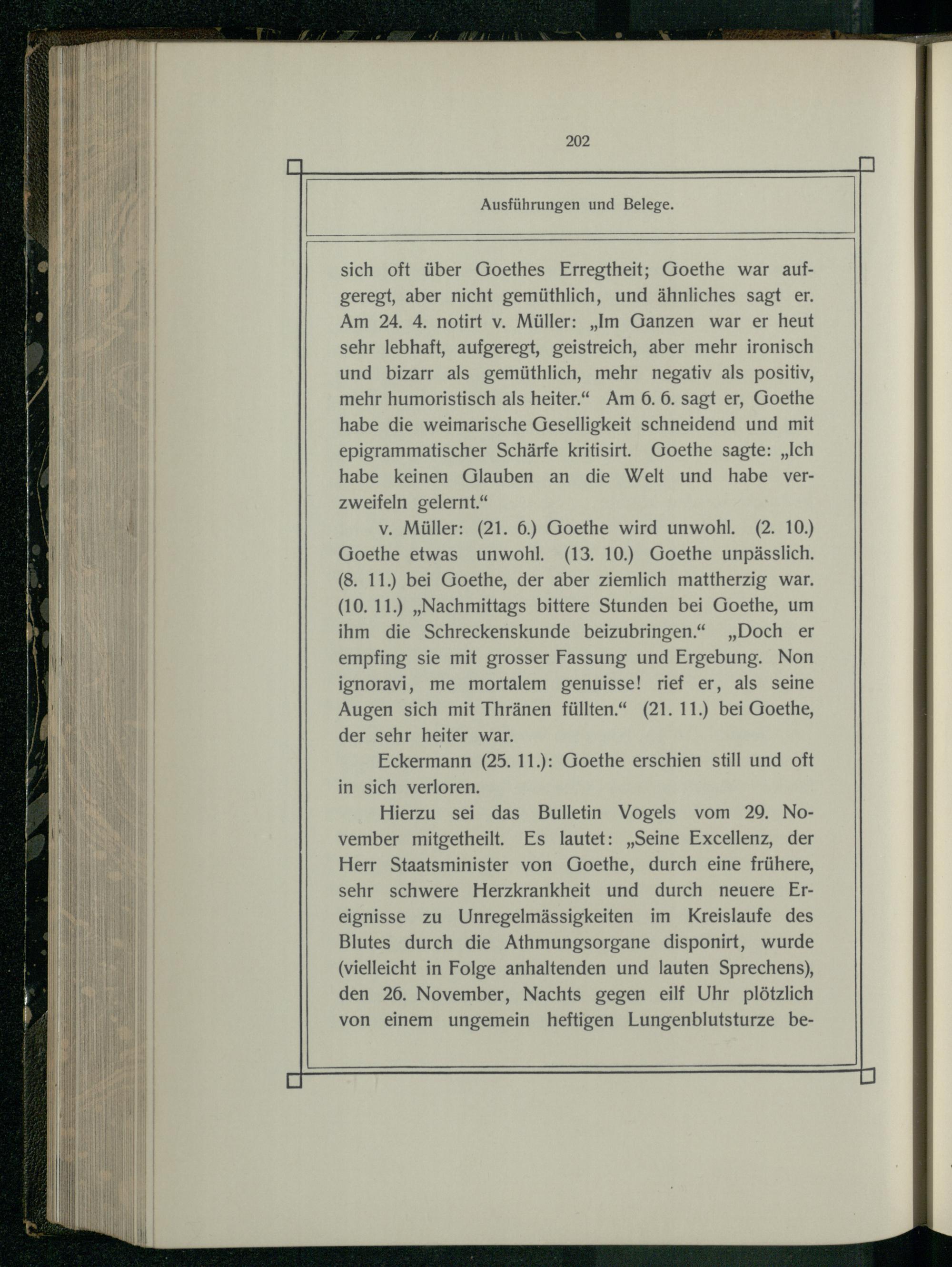 Hierzu sei das Bulletin Vogels vom 29. November mitgetheilt. Es lautet:„Seine Excellenz, der Herr Staatsminister von Goethe, durch eine frühere, sehr schwere Herzkrankheit und durch neuere Ereignisse zu Unregelmässigkeiten im Kreislaufe des Blutes durch die Athmungsorgane disponirt, wurde (vielleicht in Folge anhaltenden und lauten Sprechens), den 26. November, Nachts gegen eilf Uhr plötzlich von einem ungemein heftigen Lungenblutsturze be