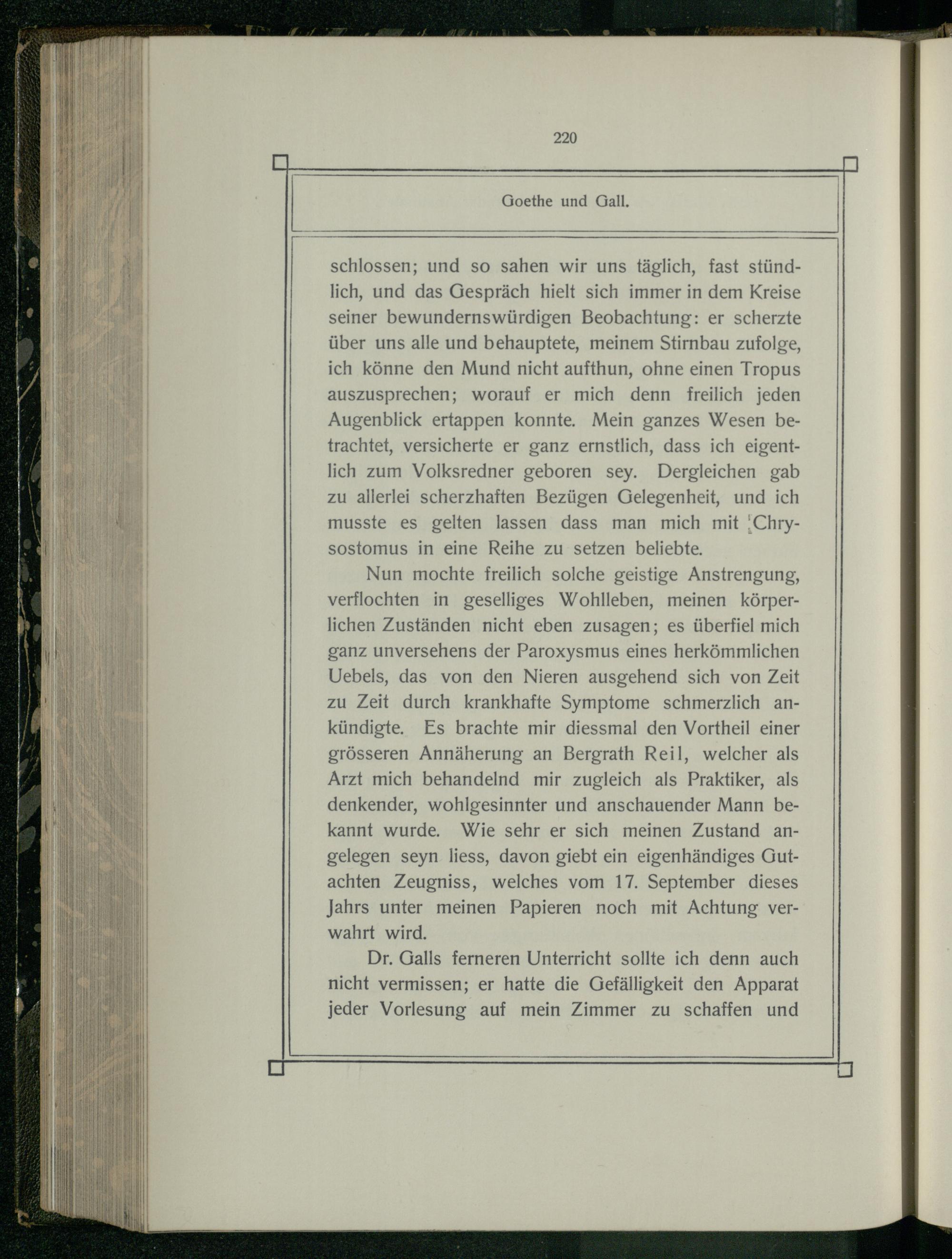 Dr. Galls ferneren Unterricht sollte ich denn auch nicht vermissen; er hatte die Gefälligkeit den Apparat jeder Vorlesung auf mein Zimmer zu schaffen und