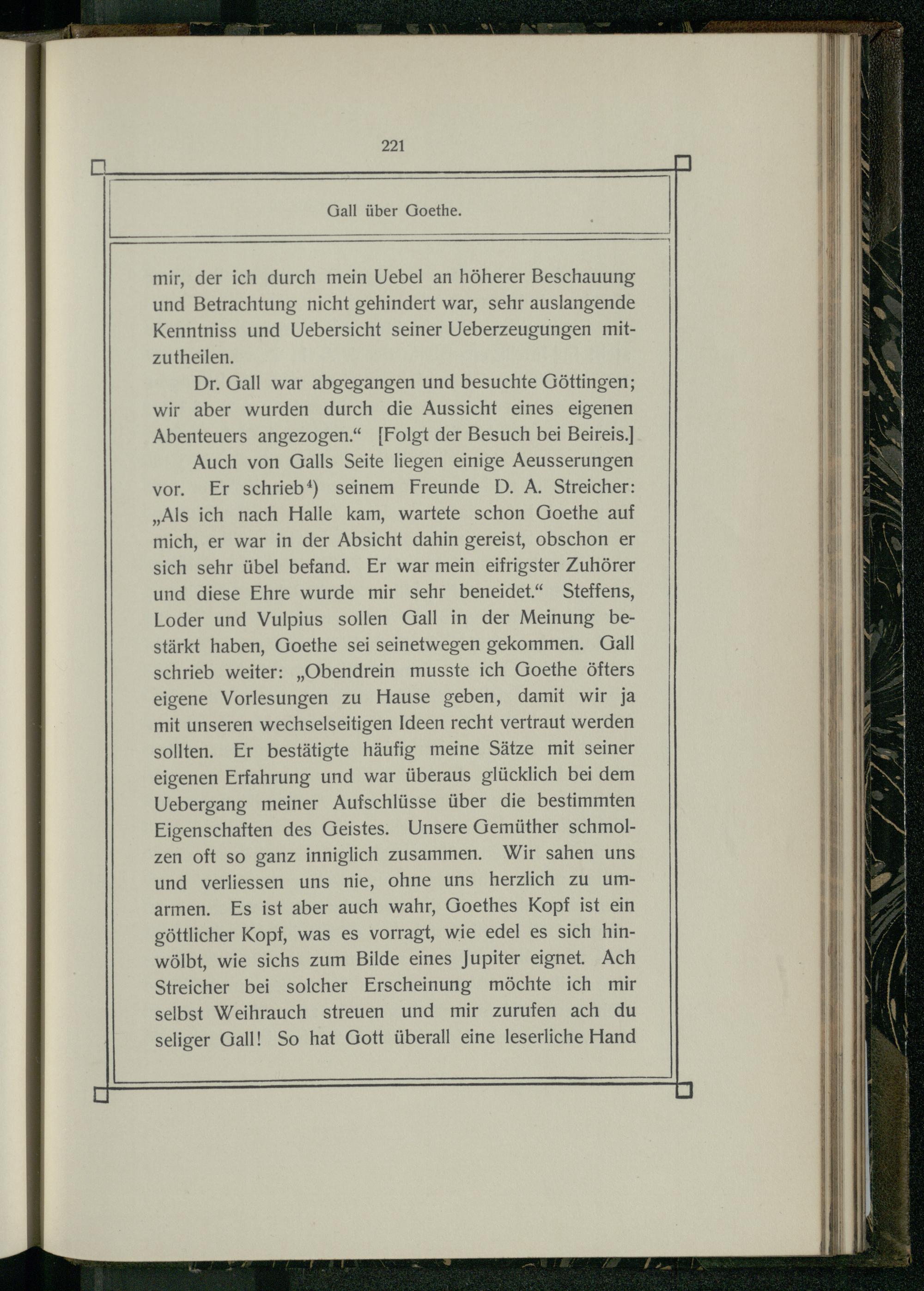 Auch von Galls Seite liegen einige Aeusserungen vor. Er schrieb‘) seinem Freunde D. A. Streicher: „Als ich nach Halle kam, wartete schon Goethe auf mich, er war in der Absicht dahin gereist, obschon er sich sehr übel befand. Er war mein eifrigster Zuhörer und diese Ehre wurde mir sehr beneidet.“ Steffens, Loder und Vulpius sollen Gall in der Meinung bestärkt haben, Goethe sei seinetwegen gekommen. Gall schrieb weiter:„Obendrein musste ich Goethe öfters eigene Vorlesungen zu Hause geben, damit wir ja mit unseren wechselseitigen Ideen recht vertraut werden sollten. Er bestätigte häufig meine Sätze mit seiner eigenen Erfahrung und war überaus glücklich bei dem Uebergang meiner Aufschlüsse über die bestimmten Eigenschaften des Geistes. Unsere Gemüther schmolzen oft so ganz inniglich zusammen. Wir sahen uns und verliessen uns nie, ohne uns herzlich zu umarmen. Es ist aber auch wahr, Goethes Kopf ist ein göttlicher Kopf, was es vorragt, wie edel es sich hinwölbt, wie sichs zum Bilde eines Jupiter eignet. Ach Streicher bei solcher Erscheinung möchte ich mir selbst Weihrauch streuen und mir zurufen ach du seliger Gall! So hat Gott überall eine leserliche Hand