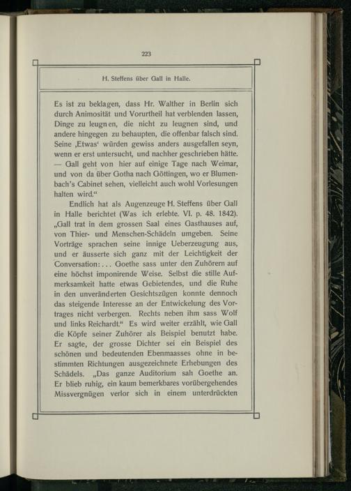 Endlich hat als Augenzeuge H. Steffens über Gall in Halle berichtet(Was ich erlebte. VI. p. 48. 1842). „Gall trat in dem grossen Saal eines Gasthauses auf, von Thier- und Menschen-Schädeln umgeben. Seine Vorträge sprachen seine innige Ueberzeugung aus, und er äusserte sich ganz mit der Leichtigkeit der Conversation:... Goethe sass unter den Zuhörern auf eine höchst imponirende Weise. Selbst die stille Aufmerksamkeit hatte etwas Gebietendes, und die Ruhe in den unveränderten Gesichtszügen konnte dennoch das steigende Interesse an der Entwickelung des Vortrages nicht verbergen. Rechts neben ihm sass Wolf und links Reichardt.“ Es wird weiter erzählt, wie Gall die Köpfe seiner Zuhörer als Beispiel benutzt habe. Er sagte, der grosse Dichter sei ein Beispiel des schönen und bedeutenden Ebenmaasses ohne in bestimmten Richtungen ausgezeichnete Erhebungen des Schädels.„Das ganze Auditorium sah Goethe an. Er blieb ruhig, ein kaum bemerkbares vorübergehendes Missvergnügen verlor sich in einem unterdrückten