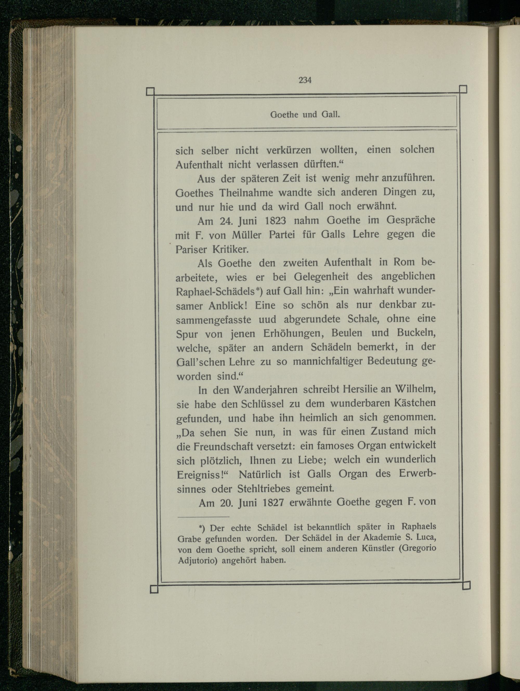 Als Goethe den zweiten Aufenthalt in Rom bearbeitete, wies er bei Gelegenheit des angeblichen Raphael-Schädels*) auf Gall hin:„Ein wahrhaft wundersamer Anblick! Eine so schön als nur denkbar zusammengefasste uud abgerundete Schale, ohne eine Spur von jenen Erhöhungen, Beulen und Buckeln, welche, später an andern Schädeln bemerkt, in der Gall’schen Lehre zu so mannichfaltiger Bedeutung ge