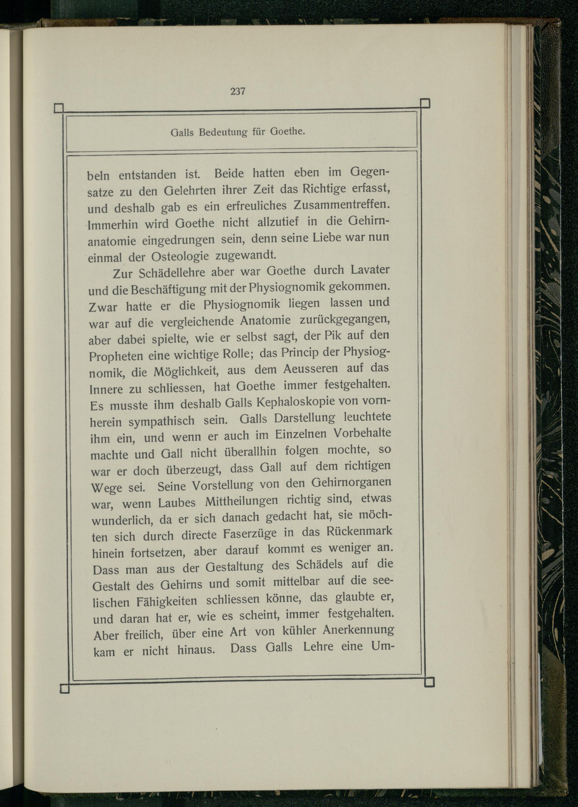 Zur Schädellehre aber war Goethe durch Lavater und die Beschäftigung mit der Physiognomik gekommen. Zwar hatte er die Physiognomik liegen lassen und war auf die vergleichende Anatomie zurückgegangen, aber dabei spielte, wie er selbst sagt, der Pik auf den Propheten eine wichtige Rolle; das Princip der Physiognomik, die Möglichkeit, aus dem Aeusseren auf das Innere zu schliessen, hat Goethe immer festgehalten. Es musste ihm deshalb Galls Kephaloskopie von vornherein sympathisch sein. Galls Darstellung leuchtete ihm ein, und wenn er auch im Einzelnen Vorbehalte machte und Gall nicht überallhin folgen mochte, so war er doch überzeugt, dass Gall auf dem richtigen Wege sei. Seine Vorstellung von den Gehirnorganen war, wenn Laubes Mittheilungen richtig sind, etwas wunderlich, da er sich danach gedacht hat, sie möchten sich durch directe Faserzüge in das Rückenmark hinein fortsetzen, aber darauf kommt es weniger an. Dass man aus der Gestaltung des Schädels auf die Gestalt des Gehirns und somit mittelbar auf die seelischen Fähigkeiten schliessen könne, das glaubte er, und daran hat er, wie es scheint, immer festgehalten. Aber freilich, über eine Art von kühler Anerkennung kam er nicht hinaus. Dass Galls Lehre eine Um