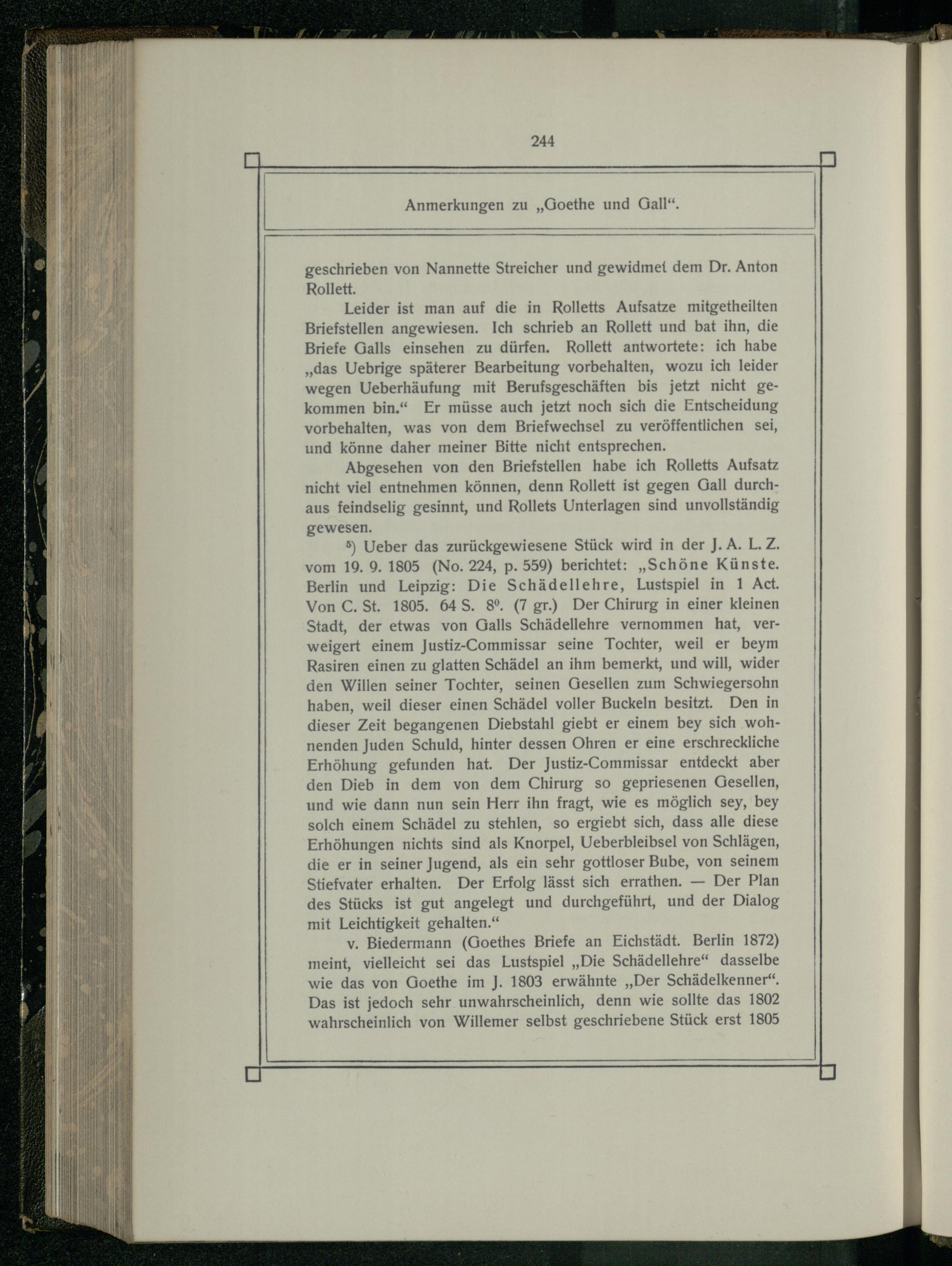 5) Ueber das zurückgewiesene Stück wird in der J. A. L.Z. vom 19. 9. 1805(No. 224, p. 559) berichtet:„Schöne Künste. Berlin und Leipzig: Die Schädellehre, Lustspiel in 1 Act. Von C. St. 1805. 645. 8°.(7 gr.) Der Chirurg in einer kleinen Stadt, der etwas von Galls Schädellehre vernommen hat, verweigert einem Justiz-Commissar seine Tochter, weil er beym Rasiren einen zu glatten Schädel an ihm bemerkt, und will, wider den Willen seiner Tochter, seinen Gesellen zum Schwiegersohn haben, weil dieser einen Schädel voller Buckeln besitzt. Den in dieser Zeit begangenen Diebstahl giebt er einem bey sich wohnenden Juden Schuld, hinter dessen Ohren er eine erschreckliche Erhöhung gefunden hat. Der Justiz-Commissar entdeckt aber den Dieb in dem von dem Chirurg so gepriesenen Gesellen, und wie dann nun sein Herr ihn fragt, wie es möglich sey, bey solch einem Schädel zu stehlen, so ergiebt sich, dass alle diese Erhöhungen nichts sind als Knorpel, Ueberbleibsel von Schlägen, die er in seiner Jugend, als ein sehr gottloser Bube, von seinem Stiefvater erhalten. Der Erfolg lässt sich errathen.— Der Plan des Stücks ist gut angelegt und durchgeführt, und der Dialog mit Leichtigkeit gehalten.“