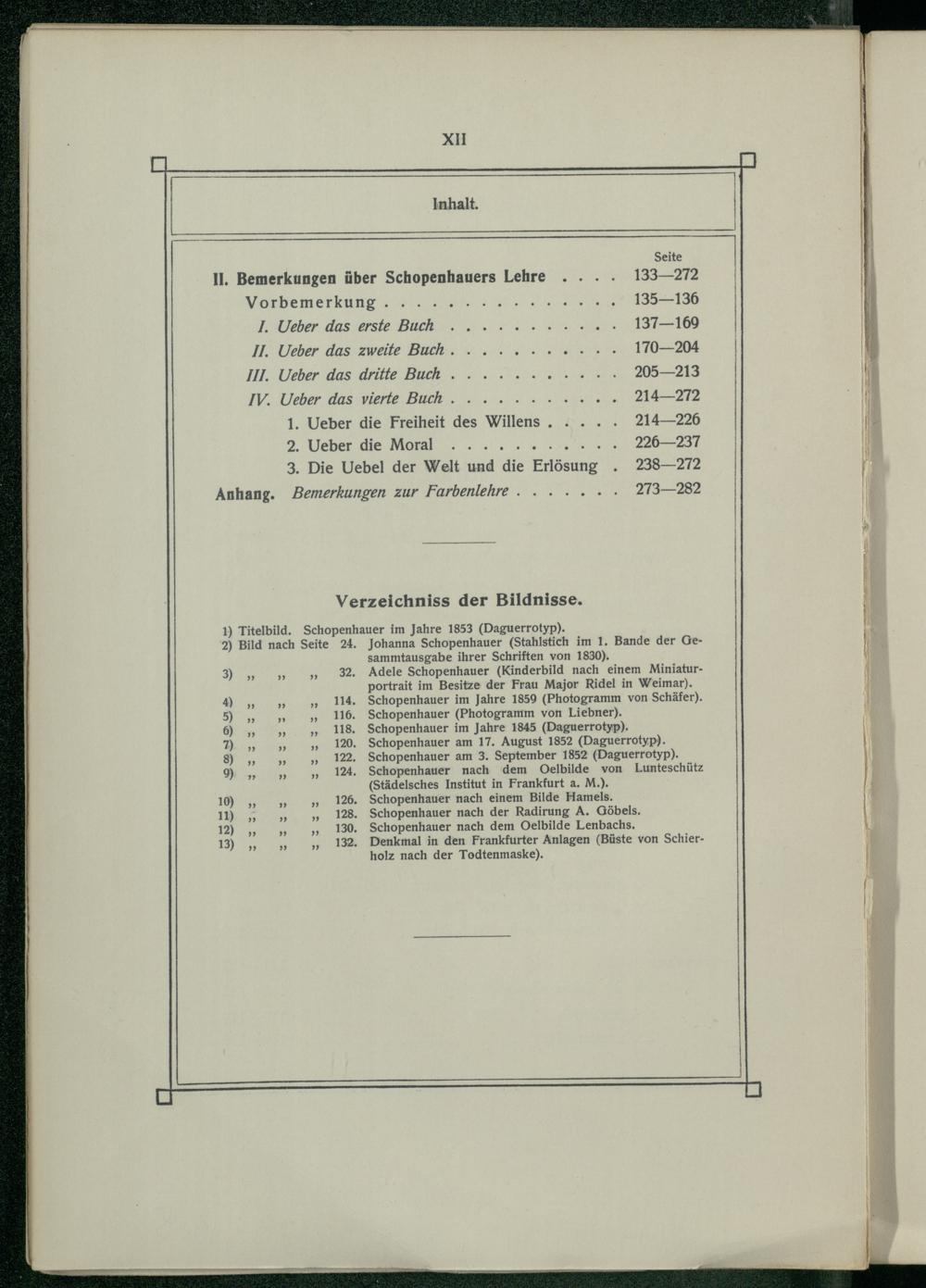 Seite Il. Bemerkungen über Schopenhauers Lehre. 133—272 Vorbemerkung.... 135—136 I. Ueber das erste Buch.. 137—169 IL. Ueber das zweite: Buch... 0.4. 170—204 III. Ueber das dritte Buch. 0.00 205—213 IV. Veber das vierte Buch... 0. 0 214—272 1. Ueber die Freiheit des Willens, 214—226 2, Ueber die Moral............. 220—237 3. Die Uebel der Welt und die Erlösung. 238—272 273—282