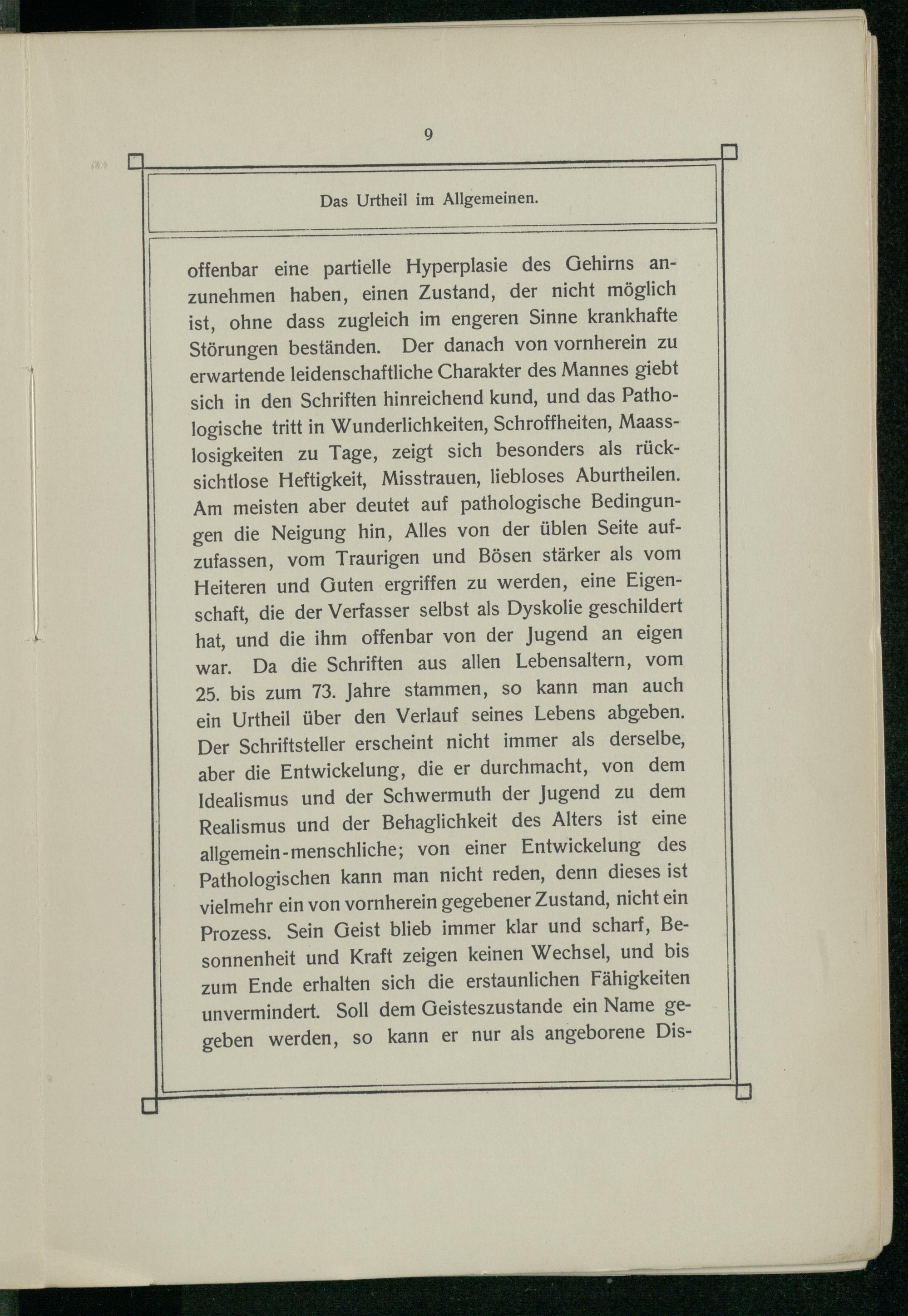 offenbar eine partielle Hyperplasie des Gehirns anzunehmen haben, einen Zustand, der nicht möglich ist, ohne dass zugleich im engeren Sinne krankhafte Störungen beständen. Der danach von vornherein zu erwartende leidenschaftliche Charakter des Mannes giebt sich in den Schriften hinreichend kund, und das Pathologische tritt in Wunderlichkeiten, Schroffheiten, Maasslosigkeiten zu Tage, zeigt sich besonders als rücksichtlose Heftigkeit, Misstrauen, liebloses Aburtheilen. Am meisten aber deutet auf pathologische Bedingungen die Neigung hin, Alles von der üblen Seite aufzufassen, vom Traurigen und Bösen stärker als vom Heiteren und Guten ergriffen zu werden, eine Eigenschaft, die der Verfasser selbst als Dyskolie geschildert hat, und die ihm offenbar von der Jugend an eigen war. Da die Schriften aus allen Lebensaltern, vom 25. bis zum 73. Jahre stammen, so kann man auch ein Urtheil über den Verlauf seines Lebens abgeben. Der Schriftsteller erscheint nicht immer als derselbe, aber die Entwickelung, die er durchmacht, von dem Idealismus und der Schwermuth der Jugend zu dem Realismus und der Behaglichkeit des Alters ist eine allgemein-menschliche; von einer Entwickelung des Pathologischen kann man nicht reden, denn dieses ist vielmehr ein von vornherein gegebener Zustand, nicht ein Prozess. Sein Geist blieb immer klar und scharf, Besonnenheit und Kraft zeigen keinen Wechsel, und bis zum Ende erhalten sich die erstaunlichen Fähigkeiten unvermindert. Soll dem Geisteszustande ein Name gegeben werden, so kann er nur als angeborene Dis