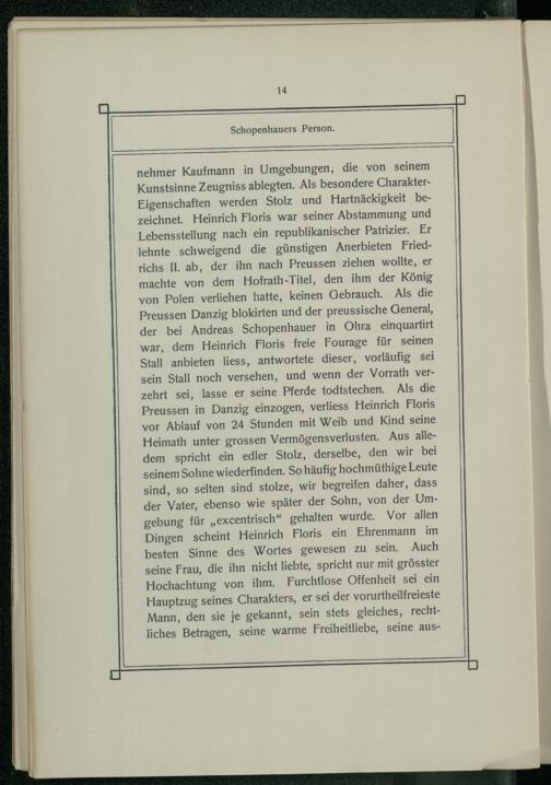 nehmer Kaufmann in Umgebungen, die von seinem Kunstsinne Zeugniss ablegten. Als besondere CharakterEigenschaften werden Stolz und Hartnäckigkeit bezeichnet. Heinrich Floris war seiner Abstammung und Lebensstellung nach ein republikanischer Patrizier. Er lehnte schweigend die günstigen Anerbieten Friedrichs II. ab, der ihn nach Preussen ziehen wollte, er machte von dem Hofrath-Titel, den ihm der König von Polen verliehen hatte, keinen Gebrauch. Als die Preussen Danzig blokirten und der preussische General, der bei Andreas Schopenhauer in Ohra einquartirt war, dem Heinrich Floris freie Fourage für seinen Stall anbieten liess, antwortete dieser, vorläufig sei sein Stall noch versehen, und wenn der Vorrath verzehrt sei, lasse er seine Pferde todtstechen. Als die Preussen in Danzig einzogen, verliess Heinrich Floris vor Ablauf von 24 Stunden mit Weib und Kind seine Heimath unter grossen Vermögensverlusten. Aus alledem spricht ein edler Stolz, derselbe, den wir bei seinem Sohne wiederfinden. So häufig hochmüthige Leute sind, so selten sind stolze, wir begreifen daher, dass der Vater, ebenso wie später der Sohn, von der Umgebung für„excentrisch“ gehalten wurde. Vor allen Dingen scheint Heinrich Floris ein Ehrenmann im besten Sinne des Wortes gewesen zu sein. Auch seine Frau, die ihn nicht liebte, spricht nur mit grösster Hochachtung von ihm. Furchtlose Offenheit sei ein Hauptzug seines Charakters, er sei der vorurtheilfreieste Mann, den sie je gekannt, sein stets gleiches, rechtliches Betragen, seine warme Freiheitliebe, seine aus