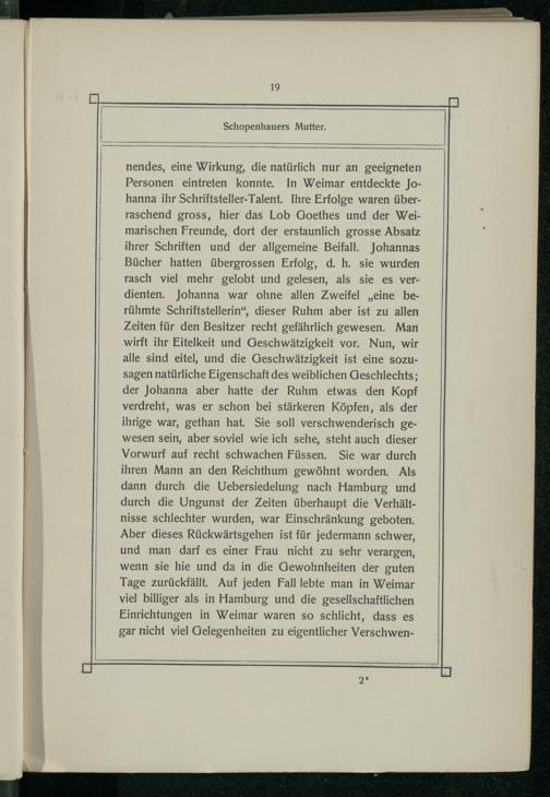 nendes, eine Wirkung, die natürlich nur an geeigneten Personen eintreten konnte. In Weimar entdeckte Johanna ihr Schriftsteller-Talent. Ihre Erfolge waren überraschend gross, hier das Lob Goethes und der Weimarischen Freunde, dort der erstaunlich grosse Absatz ihrer Schriften und der allgemeine Beifall. Johannas Bücher hatten übergrossen Erfolg, d. h. sie wurden rasch viel mehr gelobt und gelesen, als sie es verdienten. Johanna war ohne allen Zweifel„eine berühmte Schriftstellerin“, dieser Ruhm aber ist zu allen Zeiten für den Besitzer recht gefährlich gewesen. Man wirft ihr Eitelkeit und Geschwätzigkeit vor. Nun, wir alle sind eitel, und die Geschwätzigkeit ist eine sozusagen natürliche Eigenschaft des weiblichen Geschlechts; der Johanna aber hatte der Ruhm etwas den Kopf verdreht, was er schon bei stärkeren Köpfen, als der ihrige war, gethan hat. Sie soll verschwenderisch gewesen sein, aber soviel wie ich sehe, steht auch dieser Vorwurf auf recht schwachen Füssen. Sie war durch ihren Mann an den Reichthum gewöhnt worden. Als dann durch die Uebersiedelung nach Hamburg und durch die Ungunst der Zeiten überhaupt die Verhältnisse schlechter wurden, war Einschränkung geboten. Aber dieses Rückwärtsgehen ist für jedermann schwer, und man darf es einer Frau nicht zu sehr verargen, wenn sie hie und da in die Gewohnheiten der guten Tage zurückfällt. Auf jeden Fall lebte man in Weimar viel billiger als in Hamburg und die gesellschaftlichen Einrichtungen in Weimar waren so schlicht, dass es gar nicht viel Gelegenheiten zu eigentlicher Verschwen
