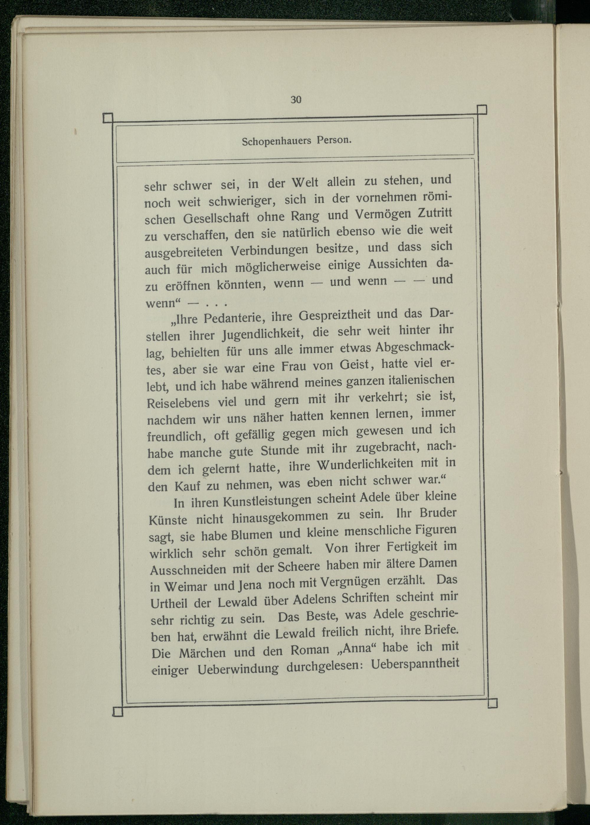 In ihren Kunstleistungen scheint Adele über kleine Künste nicht hinausgekommen zu sein. Ihr Bruder sagt, sie habe Blumen und kleine menschliche Figuren wirklich sehr schön gemalt. Von ihrer Fertigkeit im Ausschneiden mit der Scheere haben mir ältere Damen in Weimar und Jena noch mit Vergnügen erzählt. Das Urtheil der Lewald über Adelens Schriften scheint mir sehr richtig zu sein. Das Beste, was Adele geschrieben hat, erwähnt die Lewald freilich nicht, ihre Briefe. Die Märchen und den Roman„Anna“ habe ich mit einiger Ueberwindung durchgelesen: Ueberspanntheit