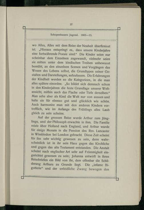 Auf der grossen Reise wurde Arthur zum Jünglinge, und der Philosoph erwachte in ihm. Die Familie reiste über Holland nach England, und Arthur wurde für einige Monate in die Pension des Rev. Lancaster in Wimbledon bei London gebracht. Diese Zeit scheint für ihn sehr wichtig gewesen zu sein, denn wahrscheinlich ist in ihr sein Hass gegen das Kirchliche und gegen das alte Testament entstanden. Die Anstalt scheint nach englischer Art sehr auf Frömmigkeit eingerichtet gewesen zu sein; Johanna entwirft in ihren Reisebriefen ein Bild von ihr, dem offenbar die Schilderung Arthurs zu Grunde liegt. Die„infame Bigotterie“ und der unleidliche Zwang bewogen den