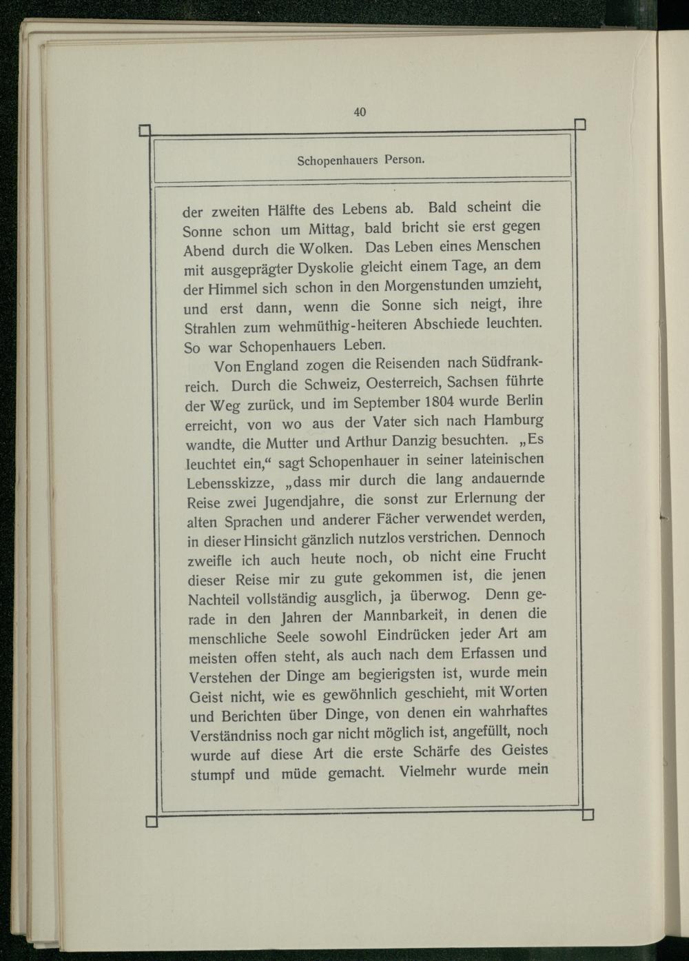 Von England zogen die Reisenden nach Südfrankreich. Durch die Schweiz, Oesterreich, Sachsen führte der Weg zurück, und im September 1804 wurde Berlin erreicht, von wo aus der Vater sich nach Hamburg wandte, die Mutter und Arthur Danzig besuchten.„Es leuchtet ein,“ sagt Schopenhauer in seiner lateinischen Lebensskizze,„dass mir durch die lang andauernde Reise zwei Jugendjahre, die sonst zur Erlernung der alten Sprachen und anderer Fächer verwendet werden, in dieser Hinsicht gänzlich nutzlos verstrichen. Dennoch zweifle ich auch heute noch, ob nicht eine Frucht dieser Reise mir zu gute gekommen ist, die jenen Nachteil vollständig ausglich, ja überwog. Denn gerade in den Jahren der Mannbarkeit, in denen die menschliche Seele sowohl Eindrücken jeder Art am meisten offen steht, als auch nach dem Erfassen und Verstehen der Dinge am begierigsten ist, wurde mein Geist nicht, wie es gewöhnlich geschieht, mit Worten und Berichten über Dinge, von denen ein wahrhaftes Verständniss noch gar nicht möglich ist, angefüllt, noch wurde auf diese Art die erste Schärfe des Geistes stumpf und müde gemacht. Vielmehr wurde mein