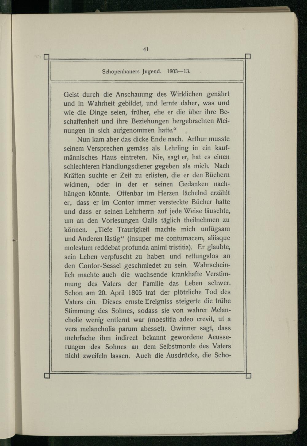 Nun kam aber das dicke Ende nach. Arthur musste seinem Versprechen gemäss als Lehrling in ein kaufmännisches Haus eintreten. Nie, sagt er, hat es einen schlechteren Handlungsdiener gegeben als mich. Nach Kräften suchte er Zeit zu erlisten, die er den Büchern widmen, oder in der er seinen Gedanken nachhängen könnte. Offenbar im Herzen lächelnd erzählt er, dass er im Contor immer versteckte Bücher hatte und dass er seinen Lehrherrn auf jede Weise täuschte, um an den Vorlesungen Galls täglich theilnehmen zu können.„Tiefe Traurigkeit machte mich unfügsam und Anderen lästig“(insuper me contumacem, aliisque molestum reddebat profunda animi tristitia). Er glaubte, sein Leben verpfuscht zu haben und rettungslos an den Contor-Sessel geschmiedet zu sein. Wahrscheinlich machte auch die wachsende krankhafte Verstimmung des Vaters der Familie das Leben schwer. Schon am 20. April 1805 trat der plötzliche Tod des Vaters ein. Dieses ernste Ereigniss steigerte die trübe Stimmung des Sohnes, sodass sie von wahrer Melancholie wenig entfernt war(moestitia adeo crevit, ut a vera melancholia parum abesset). Gwinner sagt, dass mehrfache ihm indirect bekannt gewordene Aeusserungen des Sohnes an dem Selbstmorde des Vaters nicht zweifeln lassen. Auch die Ausdrücke, die Scho