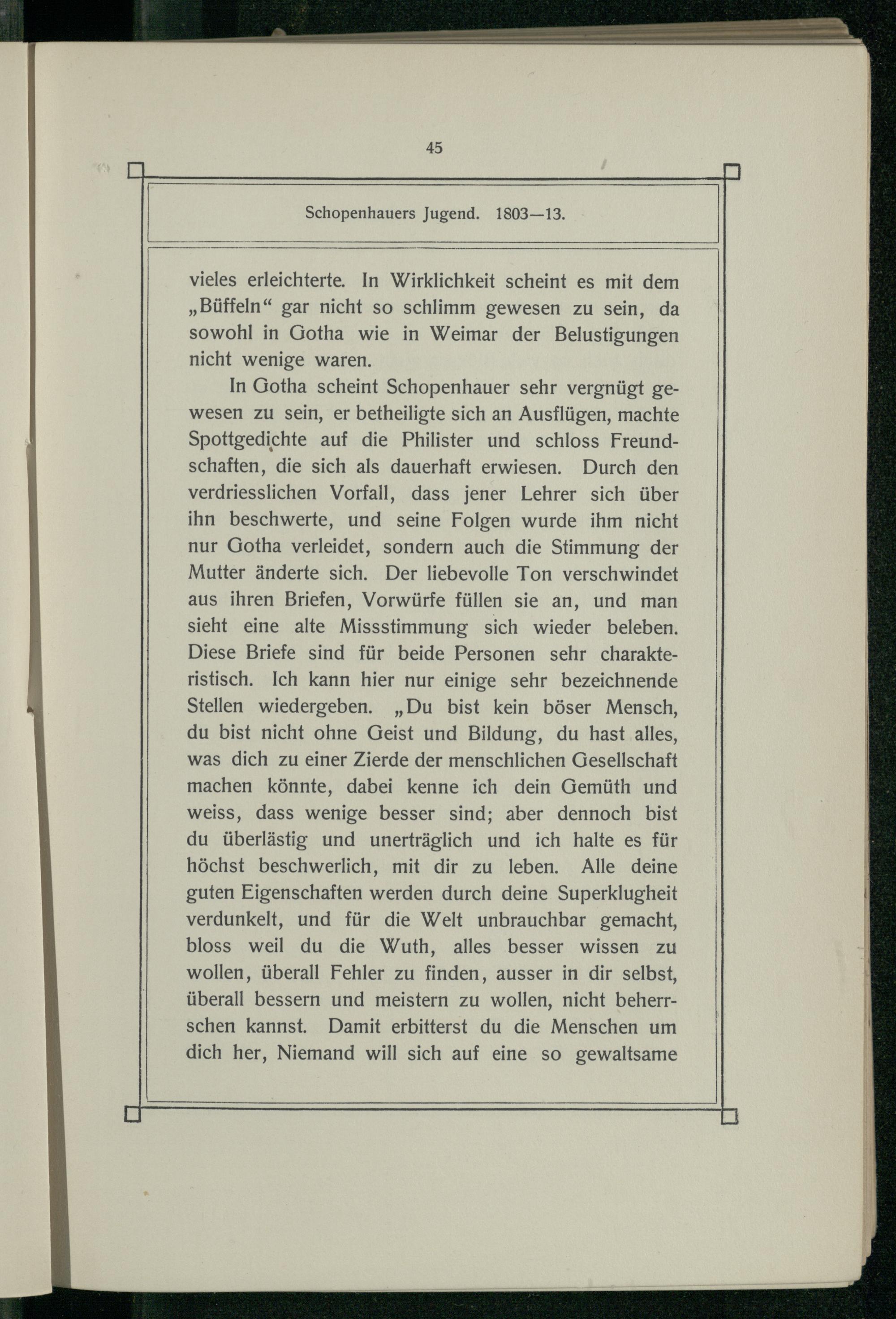In Gotha scheint Schopenhauer sehr vergnügt gewesen zu sein, er betheiligte sich an Ausflügen, machte Spottgedichte auf die Philister und schloss Freundschaften, die sich als dauerhaft erwiesen. Durch den verdriesslichen Vorfall, dass jener Lehrer sich über ihn beschwerte, und seine Folgen wurde ihm nicht nur Gotha verleidet, sondern auch die Stimmung der Mutter änderte sich. Der liebevolle Ton verschwindet aus ihren Briefen, Vorwürfe füllen sie an, und man sieht eine alte Missstimmung sich wieder beleben. Diese Briefe sind für beide Personen sehr charakteristisch. Ich kann hier nur einige sehr bezeichnende Stellen wiedergeben.„Du bist kein böser Mensch, du bist nicht ohne Geist und Bildung, du hast alles, was dich zu einer Zierde der menschlichen Gesellschaft machen könnte, dabei kenne ich dein Gemüth und weiss, dass wenige besser sind; aber dennoch bist du überlästig und unerträglich und ich halte es für höchst beschwerlich, mit dir zu leben. Alle deine guten Eigenschaften werden durch deine Superklugheit verdunkelt, und für die Welt unbrauchbar gemacht, bloss weil du die Wuth, alles besser wissen zu wollen, überall Fehler zu finden, ausser in dir selbst, überall bessern und meistern zu wollen, nicht beherrschen kannst. Damit erbitterst du die Menschen um dich her, Niemand will sich auf eine so gewaltsame