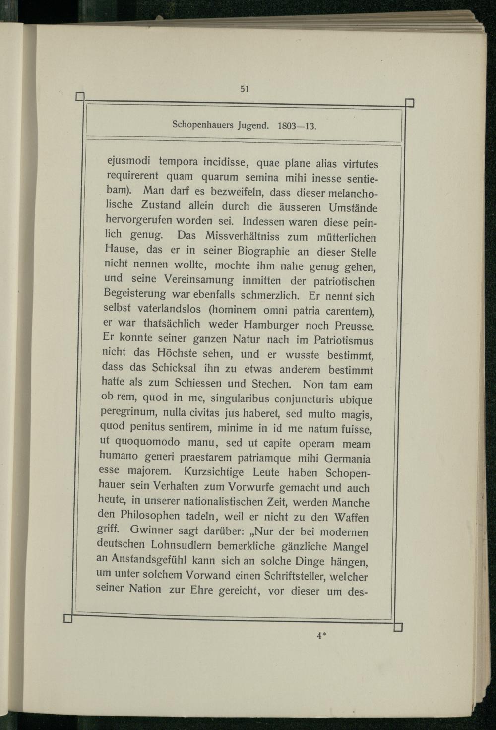 ejusmodi tempora incidisse, quae plane alias virtutes requirerent quam quarum semina mihi inesse sentiebam). Man darf es bezweifeln, dass dieser melancholische Zustand allein durch die äusseren Umstände hervorgerufen worden sei. Indessen waren diese peinlich genug. Das Missverhältniss zum mütterlichen Hause, das er in seiner Biographie an dieser Stelle nicht nennen wollte, mochte ihm nahe genug gehen, und seine Vereinsamung inmitten der patriotischen Begeisterung war ebenfalls schmerzlich. Er nennt sich selbst vaterlandslos(hominem omni patria carentem), er war thatsächlich weder Hamburger noch Preusse. Er konnte seiner ganzen Natur nach im Patriotismus nicht das Höchste sehen, und er wusste bestimmt, dass das Schicksal ihn zu etwas anderem bestimmt hatte als zum Schiessen und Stechen. Non tam eam ob rem, quod in me, singularibus conjuncturis ubique peregrinum, nulla civitas jus haberet, sed multo magis, quod penitus sentirem, minime in id me natum fuisse, ut quoquomodo manu, sed ut capite operam meam humano generi praestarem patriamque mihi Germania esse majorem. Kurzsichtige Leute haben Schopenhauer sein Verhalten zum Vorwurfe gemacht und auch heute, in unserer nationalistischen Zeit, werden Manche den Philosophen tadeln, weil er nicht zu den Waffen griff. Gwinner sagt darüber:„Nur der bei modernen deutschen Lohnsudlern bemerkliche gänzliche Mangel an Anstandsgefühl kann sich an solche Dinge hängen, um unter solchem Vorwand einen Schriftsteller, welcher seiner Nation zur Ehre gereicht, vor dieser um des