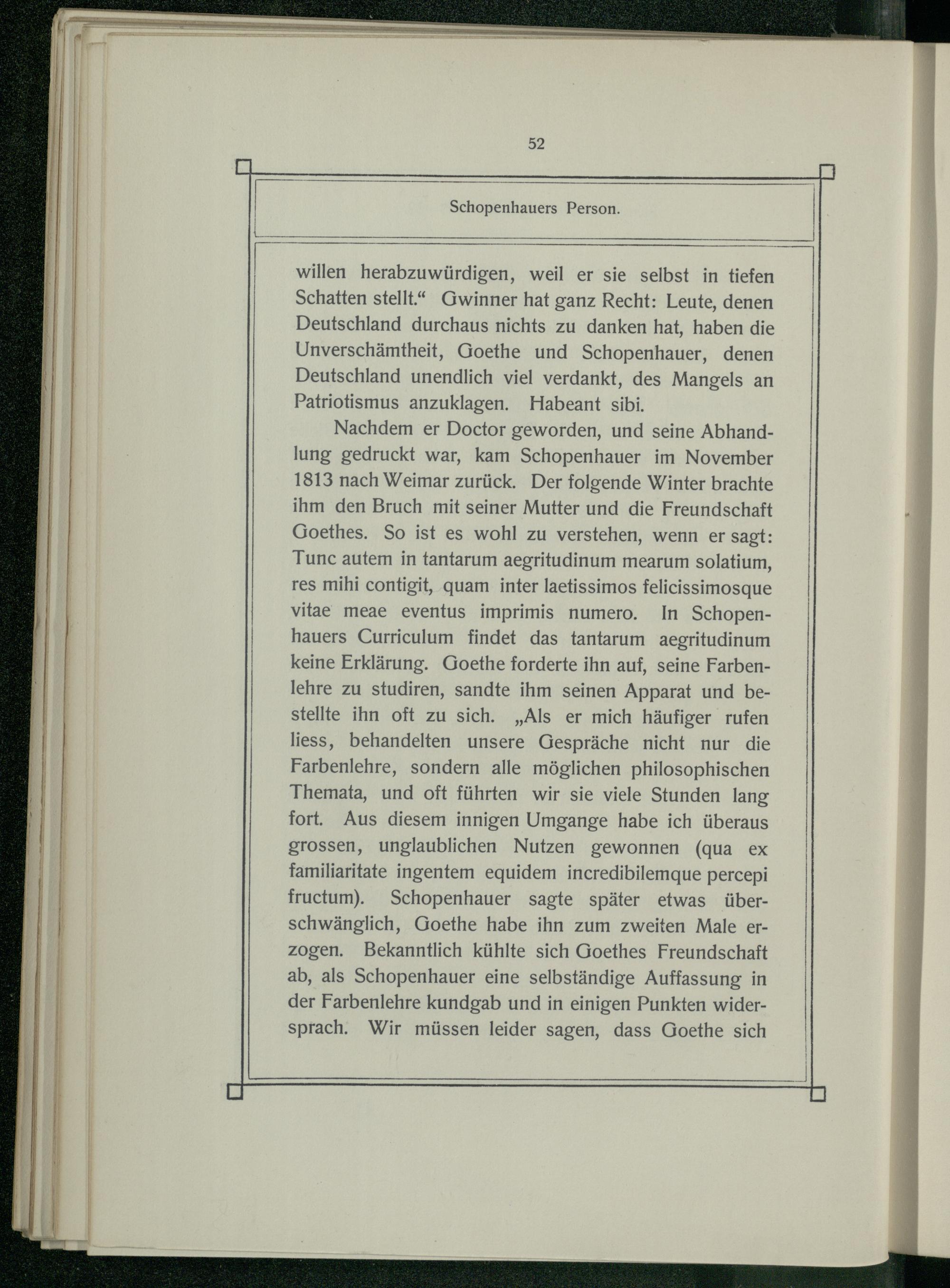 Nachdem er Doctor geworden, und seine Abhandlung gedruckt war, kam Schopenhauer im November 1813 nach Weimar zurück. Der folgende Winter brachte ihm den Bruch mit seiner Mutter und die Freundschaft Goethes. So ist es wohl zu verstehen, wenn er sagt: Tunc autem in tantarum aegritudinum mearum solatium, res mihi contigit, quam inter laetissimos felicissimosque vitae meae eventus imprimis numero. In Schopenhauers Curriculum findet das tantarum aegritudinum keine Erklärung. Goethe forderte ihn auf, seine Farbenlehre zu studiren, sandte ihm seinen Apparat und bestellte ihn oft zu sich.„Als er mich häufiger rufen liess, behandelten unsere Gespräche nicht nur die Farbenlehre, sondern alle möglichen philosophischen Themata, und oft führten wir sie viele Stunden lang fort. Aus diesem innigen Umgange habe ich überaus grossen, unglaublichen Nutzen gewonnen(qua ex familiaritate ingentem equidem incredibilemque percepi fructum). Schopenhauer sagte später etwas überschwänglich, Goethe habe ihn zum zweiten Male erzogen. Bekanntlich kühlte sich Goethes Freundschaft ab, als Schopenhauer eine selbständige Auffassung in der Farbenlehre kundgab und in einigen Punkten widersprach. Wir müssen leider sagen, dass Goethe sich