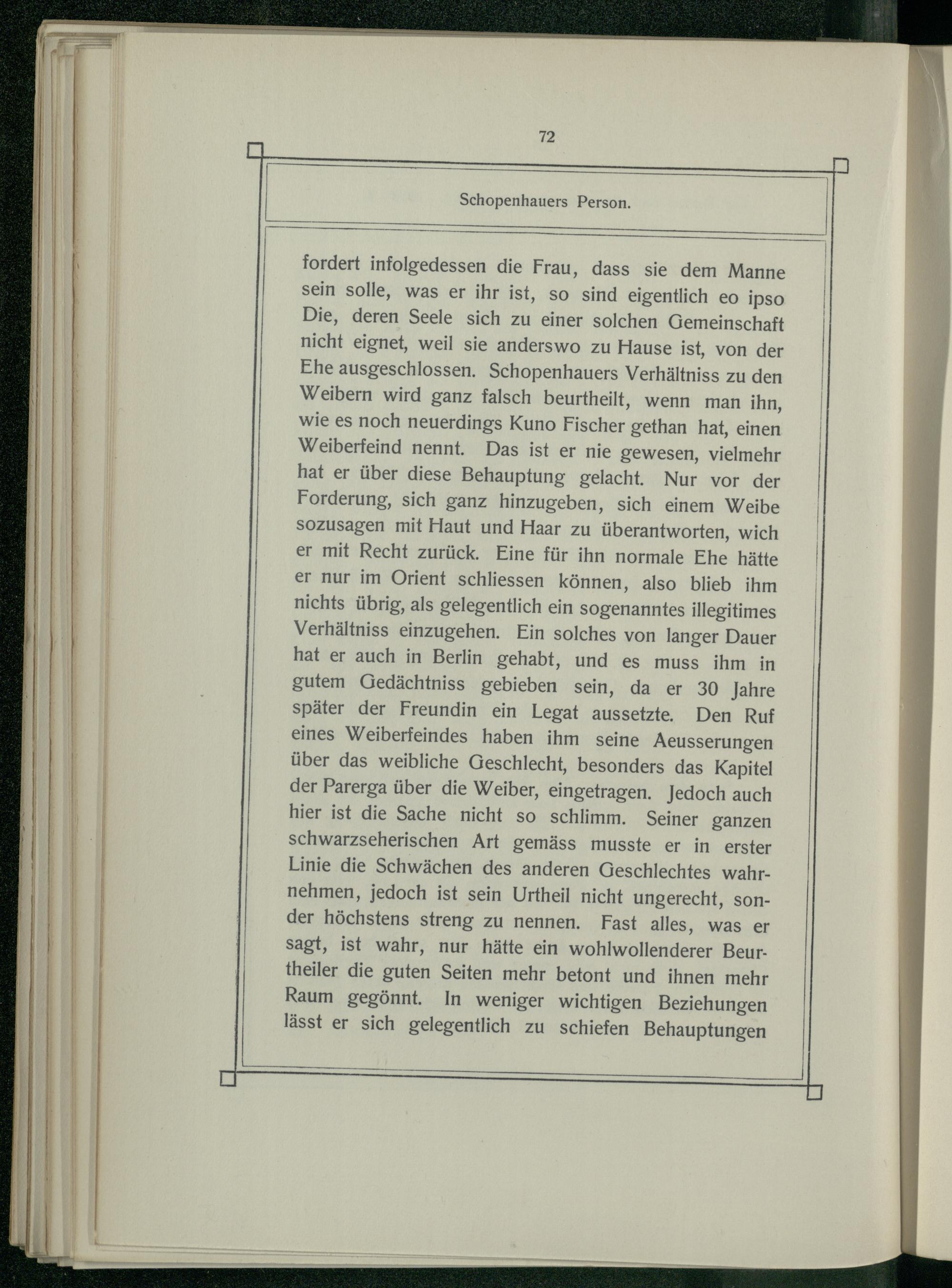 fordert infolgedessen die Frau, dass sie dem Manne sein solle, was er ihr ist, so sind eigentlich eo ipso Die, deren Seele sich zu einer solchen Gemeinschaft nicht eignet, weil sie anderswo zu Hause ist, von der Ehe ausgeschlossen. Schopenhauers Verhältniss zu den Weibern wird ganz falsch beurtheilt, wenn man ihn, wie es noch neuerdings Kuno Fischer gethan hat, einen Weiberfeind nennt. Das ist er nie gewesen, vielmehr hat er über diese Behauptung gelacht. Nur vor der Forderung, sich ganz hinzugeben, sich einem Weibe sozusagen mit Haut und Haar zu überantworten, wich er mit Recht zurück. Eine für ihn normale Ehe hätte er nur im Orient schliessen können, also blieb ihm nichts übrig, als gelegentlich ein sogenanntes illegitimes Verhältniss einzugehen. Ein solches von langer Dauer hat er auch in Berlin gehabt, und es muss ihm in gutem Gedächtniss gebieben sein, da er 30 Jahre später der Freundin ein Legat aussetzte. Den Ruf eines Weiberfeindes haben ihm seine Aeusserungen über das weibliche Geschlecht, besonders das Kapitel der Parerga über die Weiber, eingetragen. Jedoch auch hier ist die Sache nicht so schlimm. Seiner ganzen schwarzseherischen Art gemäss musste er in erster Linie die Schwächen des anderen Geschlechtes wahrnehmen, jedoch ist sein Urtheil nicht ungerecht, sonder höchstens streng zu nennen. Fast alles, was er sagt, ist wahr, nur hätte ein wohlwollenderer Beurtheiler die guten Seiten mehr betont und ihnen mehr Raum gegönnt. In weniger wichtigen Beziehungen lässt er sich gelegentlich zu schiefen Behauptungen