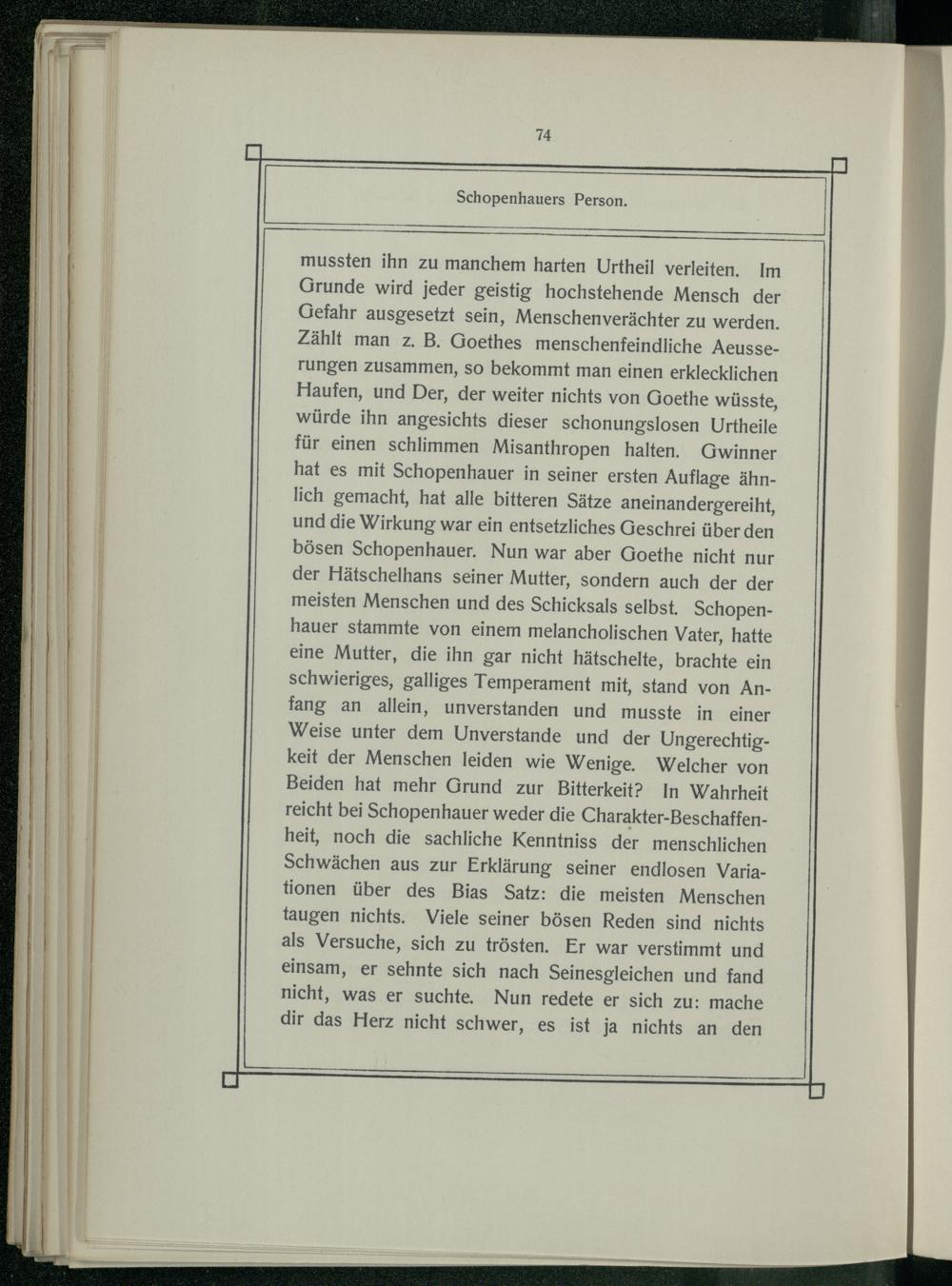 mussten ihn zu manchem harten Urtheil verleiten. Im Grunde wird jeder geistig hochstehende Mensch der Gefahr ausgesetzt sein, Menschenverächter zu werden. Zählt man z. B. Goethes menschenfeindliche Aeusserungen zusammen, so bekommt man einen erklecklichen Haufen, und Der, der weiter nichts von Goethe wüsste, würde ihn angesichts dieser schonungslosen Urtheile für einen schlimmen Misanthropen halten. Gwinner hat es mit Schopenhauer in seiner ersten Auflage ähnlich gemacht, hat alle bitteren Sätze aneinandergereiht, und die Wirkung war ein entsetzliches Geschrei über den bösen Schopenhauer. Nun war aber Goethe nicht nur der Hätschelhans seiner Mutter, sondern auch der der meisten Menschen und des Schicksals selbst. Schopenhauer stammte von einem melancholischen Vater, hatte eine Mutter, die ihn gar nicht hätschelte, brachte ein schwieriges, galliges Temperament mit, stand von Anfang an allein, unverstanden und musste in einer Weise unter dem Unverstande und der Ungerechtigkeit der Menschen leiden wie Wenige. Welcher von Beiden hat mehr Grund zur Bitterkeit? In Wahrheit reicht bei Schopenhauer weder die Charakter-Beschaffenheit, noch die sachliche Kenntniss der menschlichen Schwächen aus zur Erklärung seiner endlosen Variationen über des Bias Satz: die meisten Menschen taugen nichts. Viele seiner bösen Reden sind nichts als Versuche, sich zu trösten. Er war verstimmt und einsam, er sehnte sich nach Seinesgleichen und fand nicht, was er suchte. Nun redete er sich zu: mache dir das Herz nicht schwer, es ist ja nichts an den