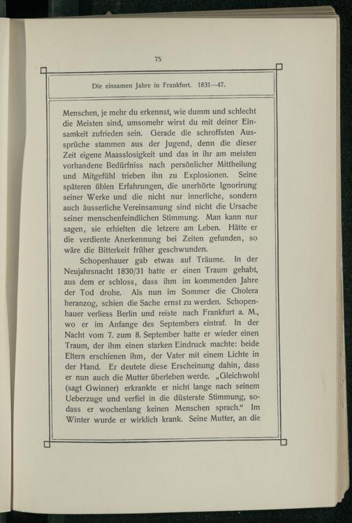 Menschen, je mehr du erkennst, wie dumm und schlecht die Meisten sind, umsomehr wirst du mit deiner Einsamkeit zufrieden sein. Gerade die schroffsten Aussprüche stammen aus der Jugend, denn die dieser Zeit eigene Maasslosigkeit und das in ihr am meisten vorhandene Bedürfniss nach persönlicher Mittheilung und Mitgefühl trieben ihn zu Explosionen. Seine späteren üblen Erfahrungen, die unerhörte Ignorirung seiner Werke und die nicht nur innerliche, sondern auch äusserliche Vereinsamung sind nicht die Ursache seiner menschenfeindlichen Stimmung. Man kann nur sagen, sie erhielten die letzere am Leben. Hätte er die verdiente Anerkennung bei Zeiten gefunden, so wäre die Bitterkeit früher geschwunden. Schopenhauer gab etwas auf Träume. In der Neujahrsnacht 1830/31 hatte er einen Traum gehabt, aus dem er schloss, dass ihm im kommenden Jahre der Tod drohe. Als nun im Sommer die Cholera heranzog, schien die Sache ernst zu werden. Schopenhauer verliess Berlin und reiste nach Frankfurt a. M., wo er im Anfange des Septembers eintraf. In der Nacht vom 7. zum 8. September hatte er wieder einen Traum, der ihm einen starken Eindruck machte: beide Eltern erschienen ihm, der Vater mit einem Lichte in der Hand. Er deutete diese Erscheinung dahin, dass er nun auch die Mutter überleben werde.„Gleichwohl (sagt Gwinner) erkrankte er nicht lange nach seinem Ueberzuge und verfiel in die düsterste Stimmung, SOdass er wochenlang keinen Menschen sprach.“ Im Winter wurde er wirklich krank. Seine Mutter, an die