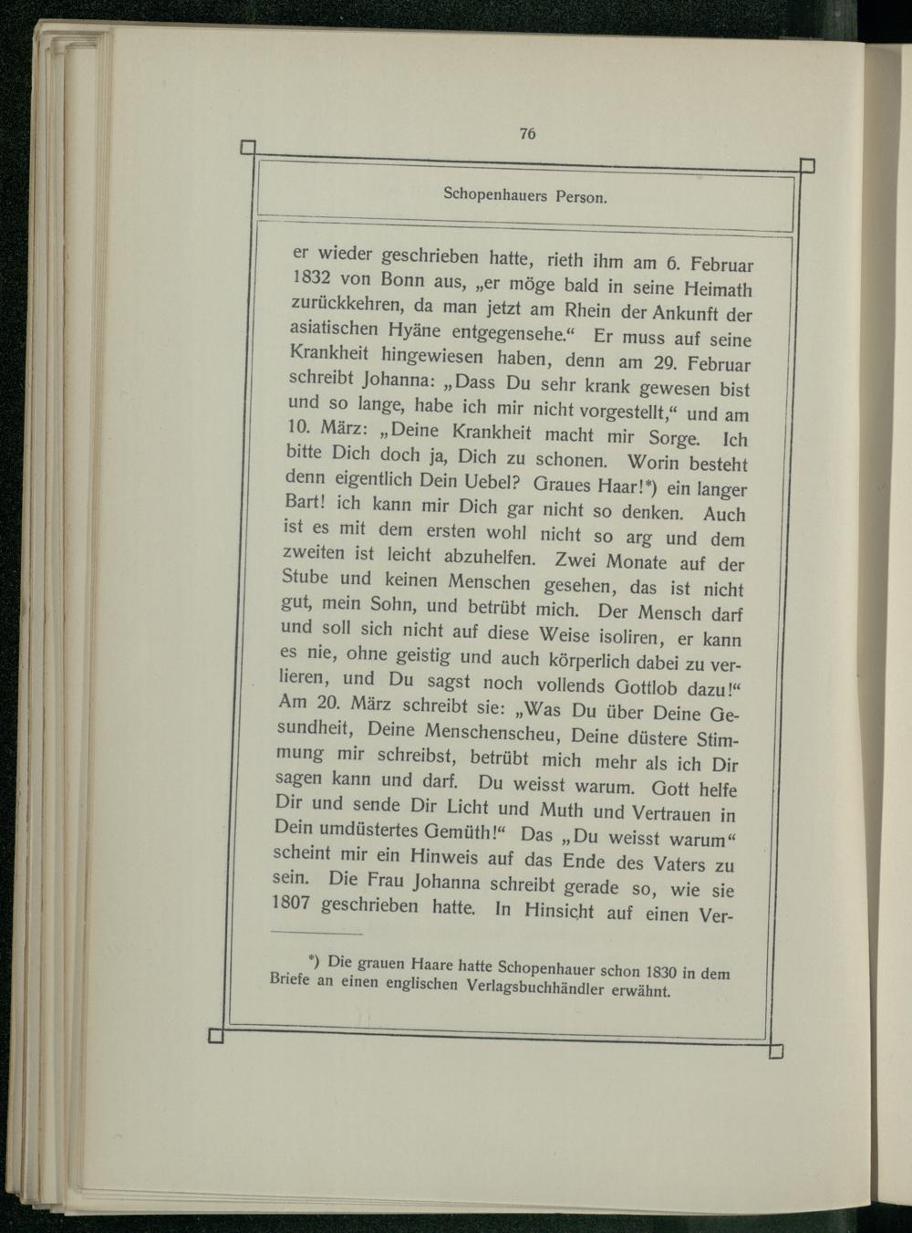 *) Die grauen Haare hatte Schopenhauer schon 1830 in dem Briefe an einen englischen Verlagsbuchhändler erwähnt.
