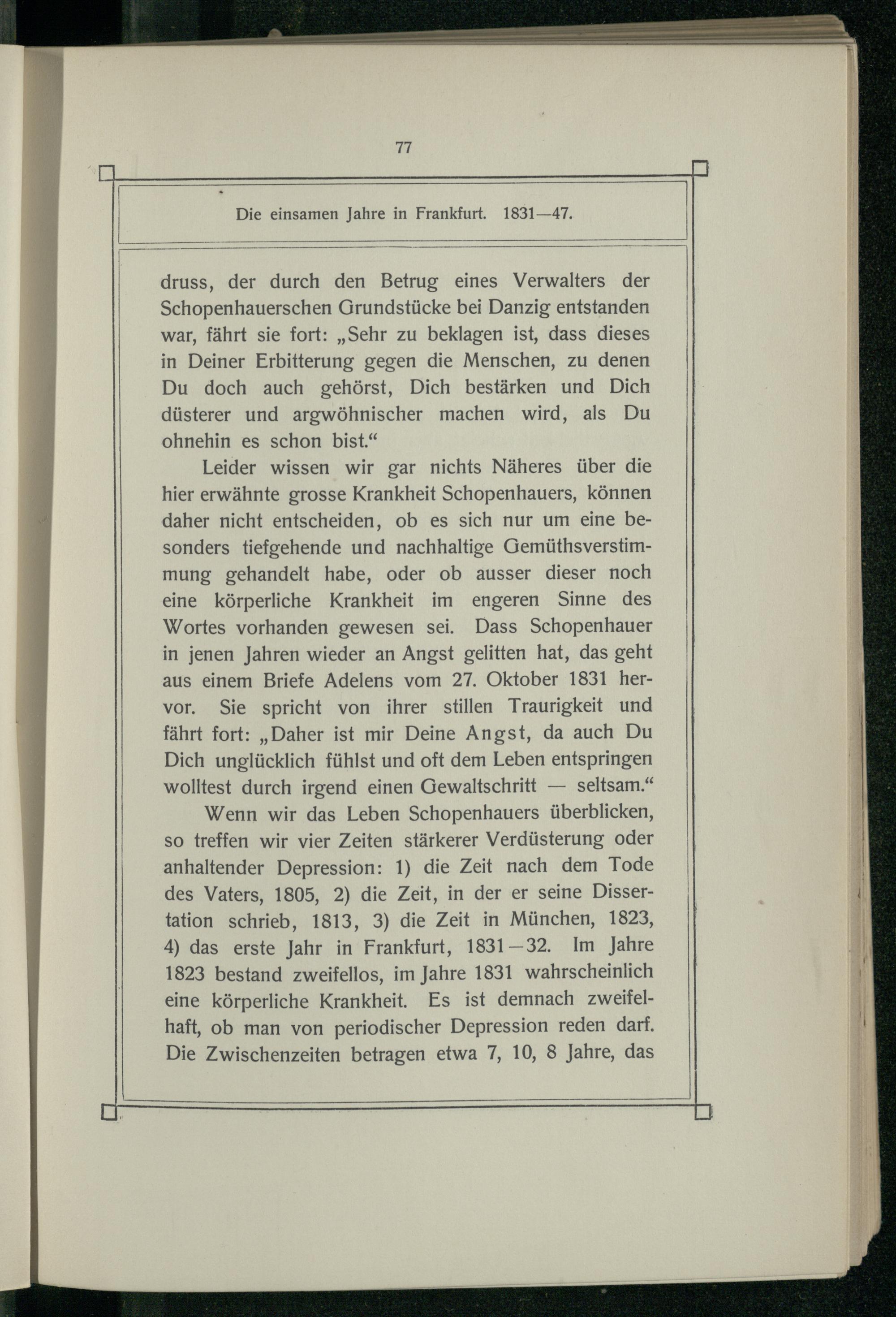 Wenn wir das Leben Schopenhauers überblicken, so treffen wir vier Zeiten stärkerer Verdüsterung oder anhaltender Depression: 1) die Zeit nach dem Tode des Vaters, 1805, 2) die Zeit, in der er seine Dissertation schrieb, 1813, 3) die Zeit in München, 1823, 4) das erste Jahr in Frankfurt, 1831—32. Im Jahre 1823 bestand zweifellos, im Jahre 1831 wahrscheinlich eine körperliche Krankheit. Es ist demnach zweifelhaft, ob man von periodischer Depression reden darf. Die Zwischenzeiten betragen etwa 7, 10, 8 Jahre, das