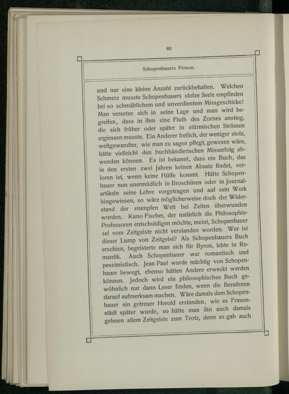 und nur eine kleine Anzahl zurückbehalten. Welchen Schmerz musste Schopenhauers stolze Seele empfinden bei so schmählichem und unverdientem Missgeschicke! Man versetze sich in seine Lage und man wird begreifen, dass in ihm eine Fluth des Zornes anstieg, die sich früher oder später in stürmischen Strömen ergiessen musste. Ein Anderer freilich, der weniger stolz, weltgewandter, wie man zu Sagen pflegt, gewesen wäre, hätte vielleicht den buchhändlerischen Misserfolg abwenden können. Es ist bekannt, dass ein Buch, das in den ersten zwei Jahren keinen Absatz findet, verloren ist, wenn keine Hülfe kommt. Hätte Schopenhauer nun unermüdlich in Broschüren oder in Journalartikeln seine Lehre vorgetragen und auf sein Werk hingewiesen, so wäre möglicherweise doch der Widerstand der stumpfen Welt bei Zeiten überwunden worden. Kuno Fischer, der natürlich die PhilosophieProfessoren entschuldigen möchte, meint, Schopenhauer sei vom Zeitgeiste nicht verstanden worden. Wer ist dieser Lump von Zeitgeist? Als Schopenhauers Buch erschien, begeisterte man sich für Byron, lebte in Romantik. Auch Schopenhauer war romantisch und pessimistisch. Jean Paul wurde mächtig von Schopenhauer bewegt, ebenso hätten Andere erweckt werden können. Jedoch wird ein philosophisches Buch ge wöhnlich nur dann Leser finden, wenn die Berufenen darauf aufmerksam machen. Wäre damals dem Schopenhauer ein getreuer Herold erstanden, wie es Frauenstädt später wurde, SO hätte man ihn auch damals gelesen allem Zeitgeiste zum Trotz, denn es gab auch