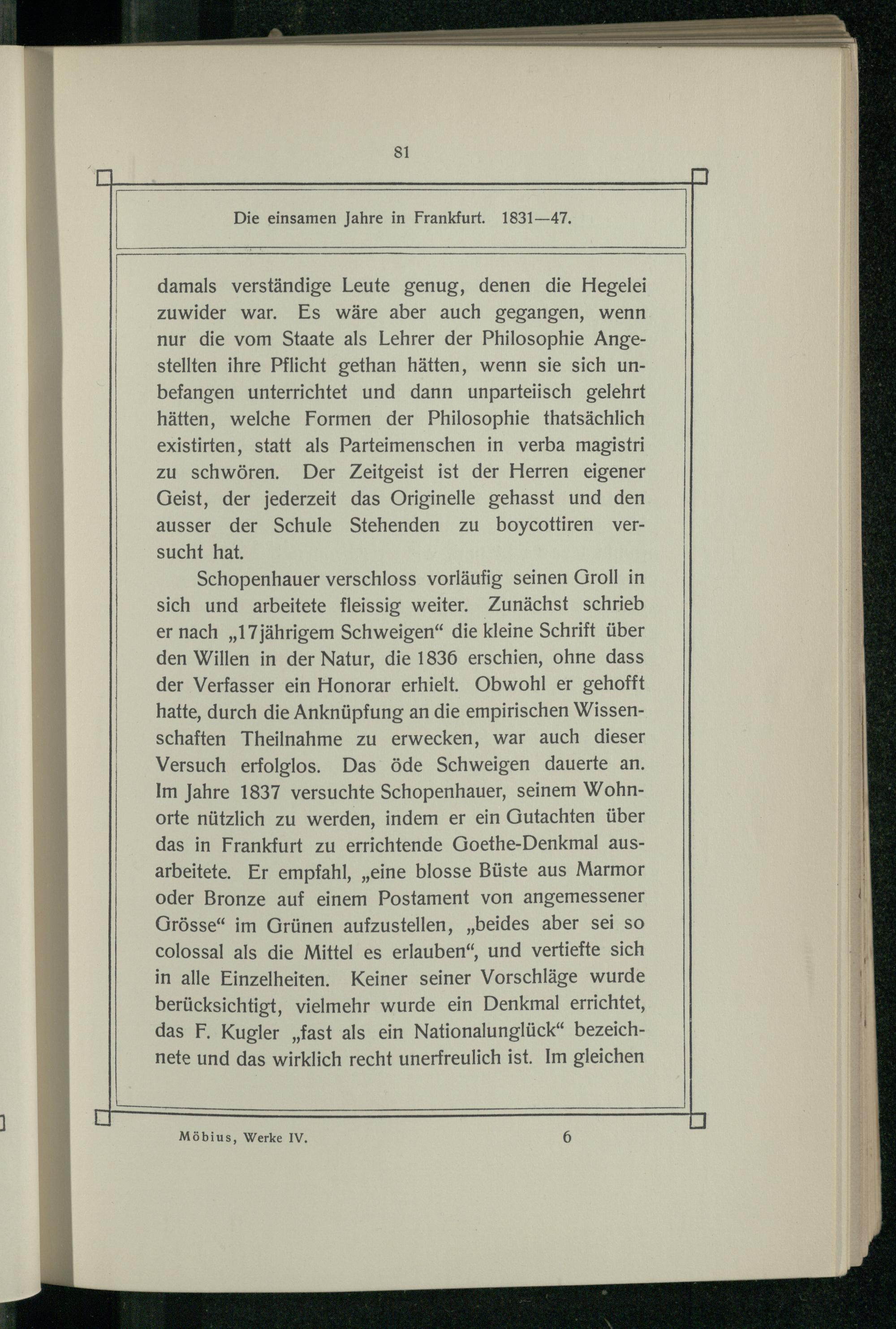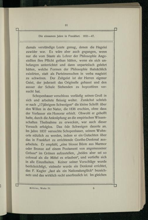 Schopenhauer verschloss vorläufig seinen Groll in sich und arbeitete fleissig weiter. Zunächst schrieb er nach„17jährigem Schweigen“ die kleine Schrift über den Willen in der Natur, die 1836 erschien, ohne dass der Verfasser ein Honorar erhielt. Obwohl er gehofft hatte, durch die Anknüpfung an die empirischen Wissenschaften Theilnahme zu erwecken, war auch dieser Versuch erfolglos. Das öde Schweigen dauerte an. Im Jahre 1837 versuchte Schopenhauer, seinem Wohnorte nützlich zu werden, indem er ein Gutachten über das in Frankfurt zu errichtende Goethe-Denkmal ausarbeitete. Er empfahl,„eine blosse Büste aus Marmor oder Bronze auf einem Postament von angemessener Grösse“ im Grünen aufzustellen,„beides aber sei so colossal als die Mittel es erlauben“, und vertiefte sich in alle Einzelheiten. Keiner seiner Vorschläge wurde berücksichtigt, vielmehr wurde ein Denkmal errichtet, das F, Kugler„fast als ein Nationalunglück“ bezeichnete und das wirklich recht unerfreulich ist. Im gleichen
