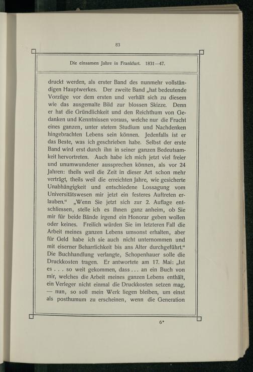 druckt werden, als erster Band des nunmehr vollständigen Hauptwerkes. Der zweite Band„hat bedeutende Vorzüge vor dem ersten und verhält sich zu diesem wie das ausgemalte Bild zur blossen Skizze. Denn er hat die Gründlichkeit und den Reichthum von Gedanken und Kenntnissen voraus, welche nur die Frucht eines ganzen, unter stetem Studium und Nachdenken hingebrachten Lebens sein können. Jedenfalls ist er das Beste, was ich geschrieben habe. Selbst der erste Band wird erst durch ihn in seiner ganzen Bedeutsamkeit hervortreten. Auch habe ich mich jetzt viel freier und unumwundener aussprechen können, als vor 24 Jahren: theils weil die Zeit in dieser Art schon mehr verträgt, theils weil die erreichten Jahre, wie gesicherte Unabhängigkeit und entschiedene Lossagung vom Universitätswesen mir jetzt ein festeres Auftreten erlauben.“„Wenn Sie jetzt sich zur 2. Auflage entschliessen, stelle ich es Ihnen ganz anheim, ob Sie mir für beide Bände irgend ein Honorar geben wollen oder keines. Freilich würden Sie im letzteren Fall die Arbeit meines ganzen Lebens umsonst erhalten, aber für Geld habe ich sie auch nicht unternommen und mit eiserner Beharrlichkeit bis ans Alter durchgeführt.“ Die Buchhandlung verlangte, Schopenhauer solle die Druckkosten tragen. Er antwortete am 17. Mai:„Ist es... SO weit gekommen, dass... an ein Buch von mir, welches die Arbeit meines ganzen Lebens enthält, ein Verleger nicht einmal die Druckkosten setzen mag, — nun, so soll mein Werk liegen bleiben, um einst als posthumum zu erscheinen, wenn die Generation