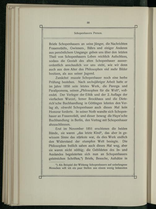 Erst im November 1851 erschienen die beiden Bände, sie waren„das letzte Kind“, das aber in gewissem Sinne das stärkste war, da dies Werk endlich den Widerstand der stumpfen Welt besiegte. Die Philosophen freilich sahen auch dieses Mal weg, aber sie waren. nicht nöthig; die Gebildeten des In- und Auslandes begeisterten sich nun an Schopenhauers geistreichen Schriften,*) Briefe, Besuche, Aufsätze in
