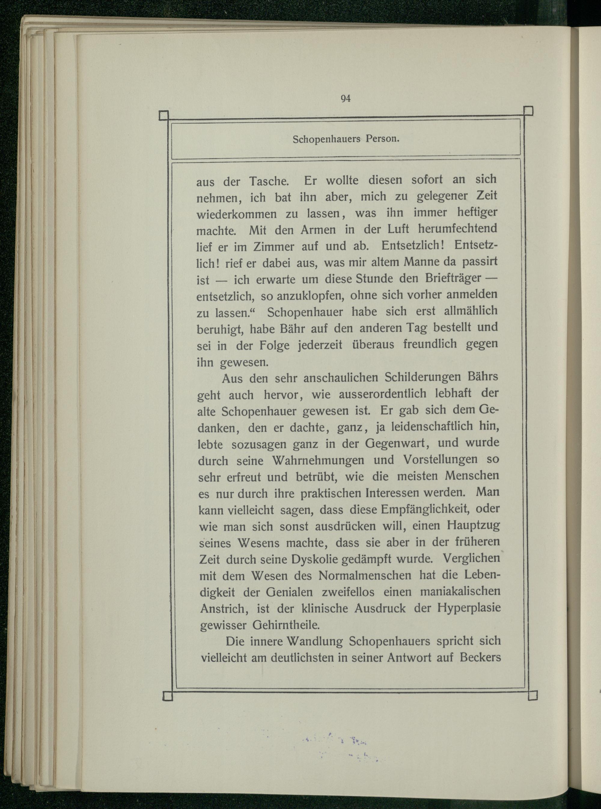 Aus den sehr anschaulichen Schilderungen Bährs geht auch hervor, wie ausserordentlich lebhaft der alte Schopenhauer gewesen ist. Er gab sich dem Gedanken, den er dachte, ganz, ja leidenschaftlich hin, lebte sozusagen ganz in der Gegenwart, und wurde durch seine Wahrnehmungen und Vorstellungen so sehr erfreut und betrübt, wie die meisten Menschen es nur durch ihre praktischen Interessen werden. Man kann vielleicht sagen, dass diese Empfänglichkeit, oder wie man sich sonst ausdrücken will, einen Hauptzug seines Wesens machte, dass sie aber in der früheren Zeit durch seine Dyskolie gedämpft wurde. Verglichen mit dem Wesen des Normalmenschen hat die Lebendigkeit der Genialen zweifellos einen maniakalischen Anstrich, ist der klinische Ausdruck der Hyperplasie gewisser Gehirntheile.