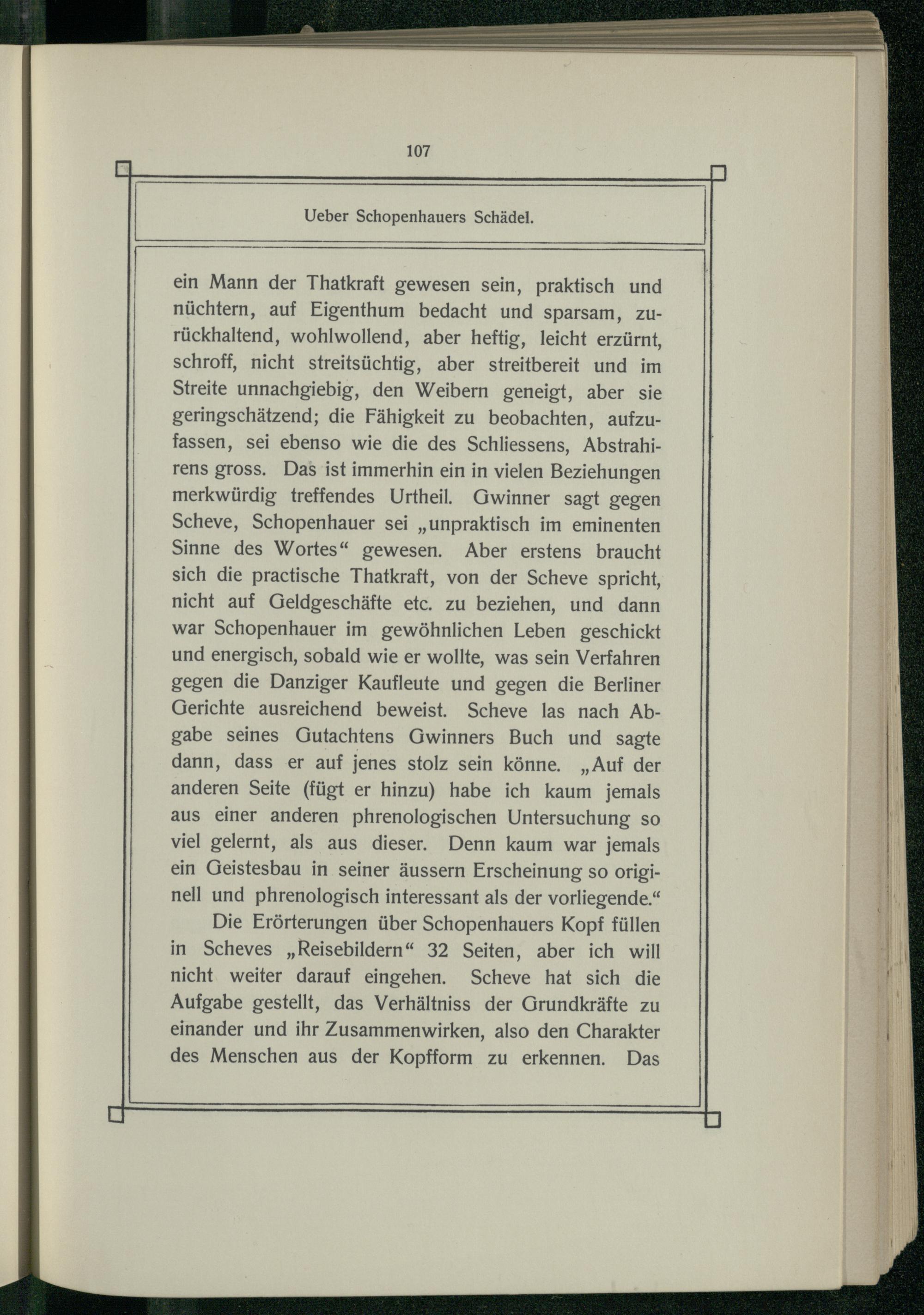 Die Erörterungen über Schopenhauers Kopf füllen in Scheves„Reisebildern“ 32 Seiten, aber ich will nicht weiter darauf eingehen. Scheve hat sich die Aufgabe gestellt, das Verhältniss der Grundkräfte zu einander und ihr Zusammenwirken, also den Charakter des Menschen aus der Kopfform zu erkennen. Das