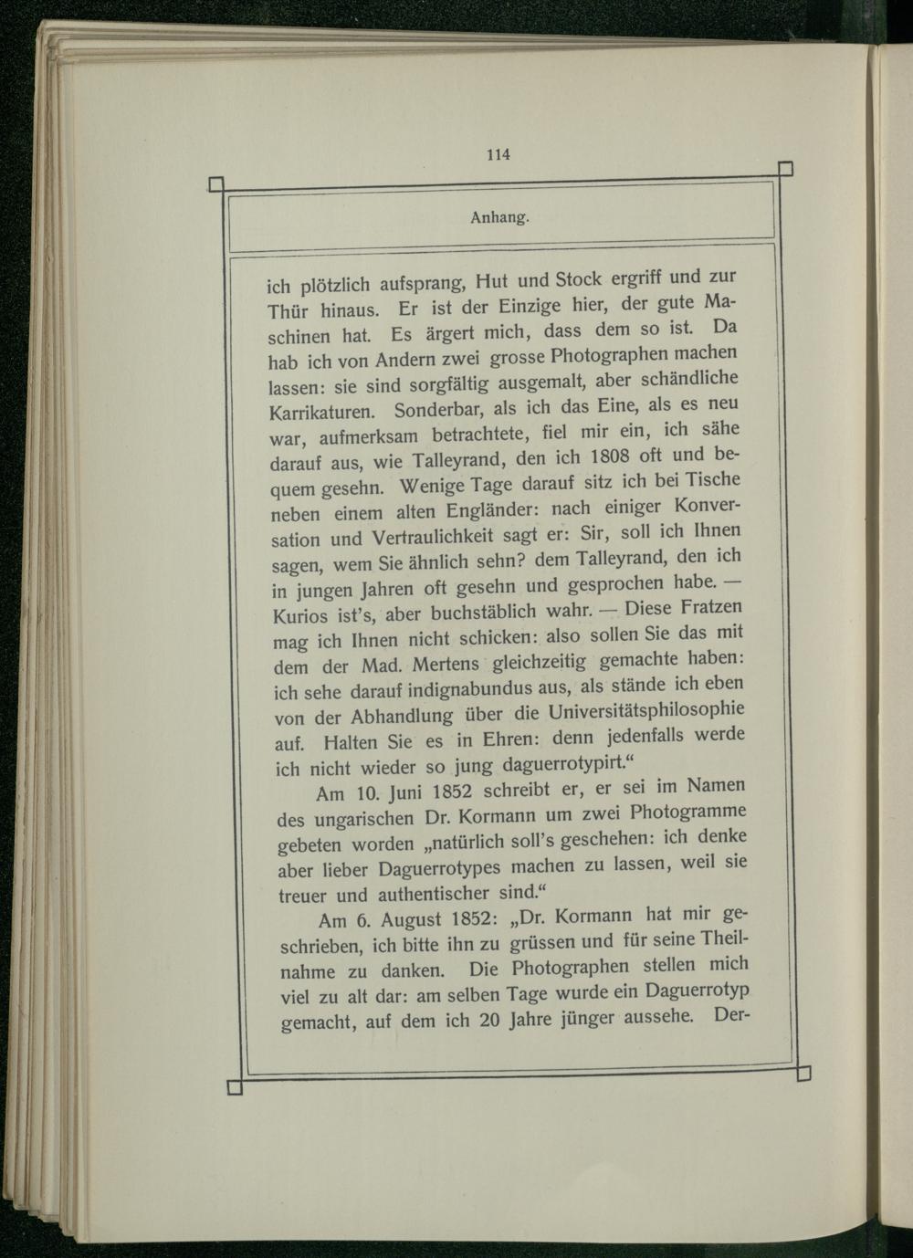 ich plötzlich aufsprang, Hut und Stock ergriff und zur Thür hinaus. Er ist der Einzige hier, der gute Maschinen hat. Es ärgert mich, dass dem so ist. Da hab ich von Andern zwei grosse Photographen machen lassen: sie sind sorgfältig ausgemalt, aber schändliche Karrikaturen. Sonderbar, als ich das Eine, als es neu war, aufmerksam betrachtete, fiel mir ein, ich sähe darauf aus, wie Talleyrand, den ich 1808 oft und bequem gesehn. Wenige Tage darauf sitz ich bei Tische neben einem alten Engländer: nach einiger Konversation und Vertraulichkeit sagt er: Sir, soll ich Ihnen sagen, wem Sie ähnlich sehn? dem Talleyrand, den ich in jungen Jahren oft gesehn und gesprochen habe.— Kurios ist’s, aber buchstäblich wahr.— Diese Fratzen mag ich Ihnen nicht schicken: also sollen Sie das mit dem der Mad. Mertens gleichzeitig gemachte haben: ich sehe darauf indignabundus aus, als stände ich eben von der Abhandlung über‘die Universitätsphilosophie auf. Halten Sie es in Ehren: denn jedenfalls werde ich nicht wieder so jung daguerrotypirt.“