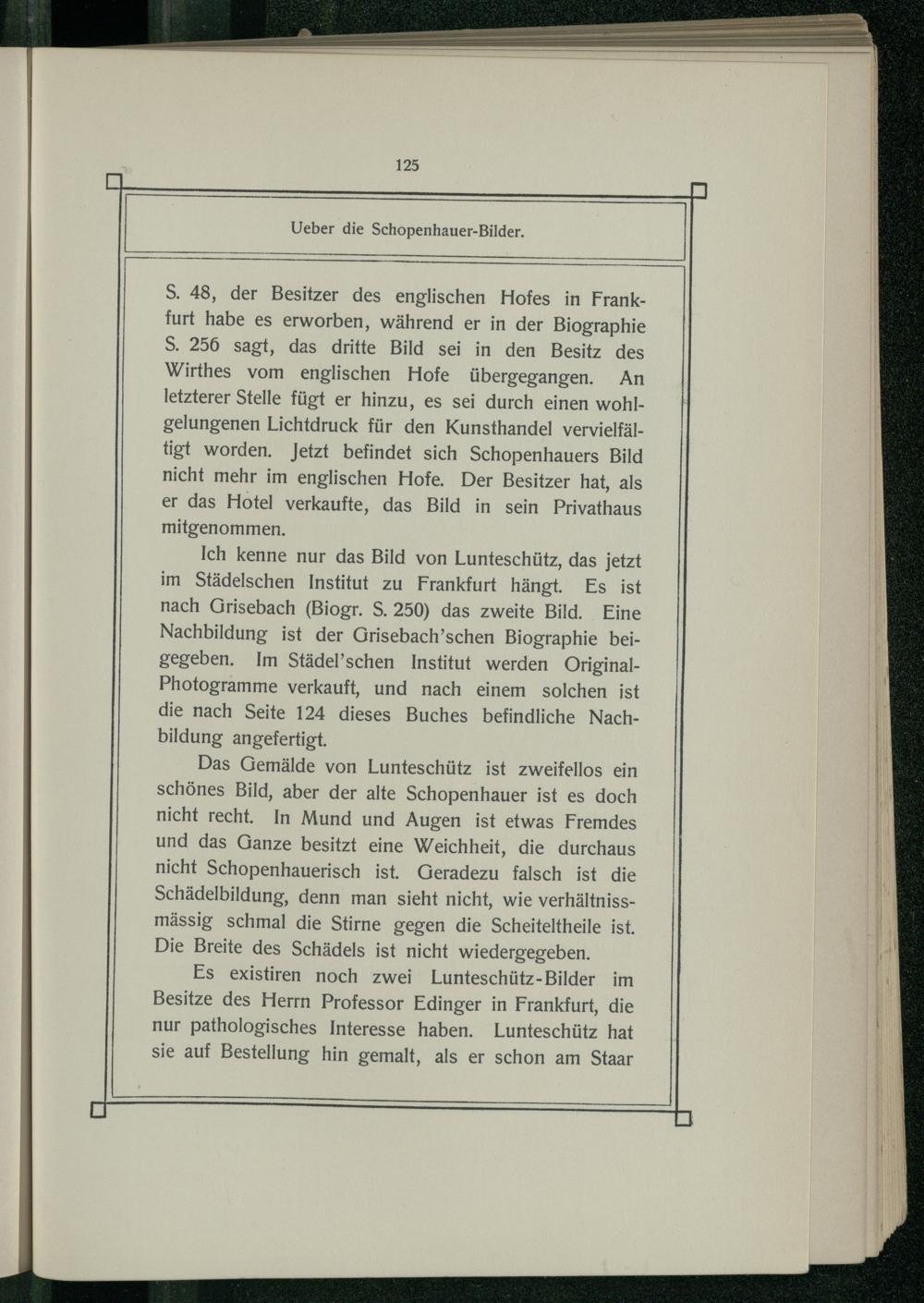Das Gemälde von Lunteschütz ist zweifellos ein schönes Bild, aber der alte Schopenhauer ist es doch nicht recht. In Mund und Augen ist etwas Fremdes und das Ganze besitzt eine Weichheit, die durchaus nicht Schopenhauerisch ist. Geradezu falsch ist die Schädelbildung, denn man sieht nicht, wie verhältnissmässig schmal die Stirne gegen die Scheiteltheile ist. Die Breite des Schädels ist nicht wiedergegeben.