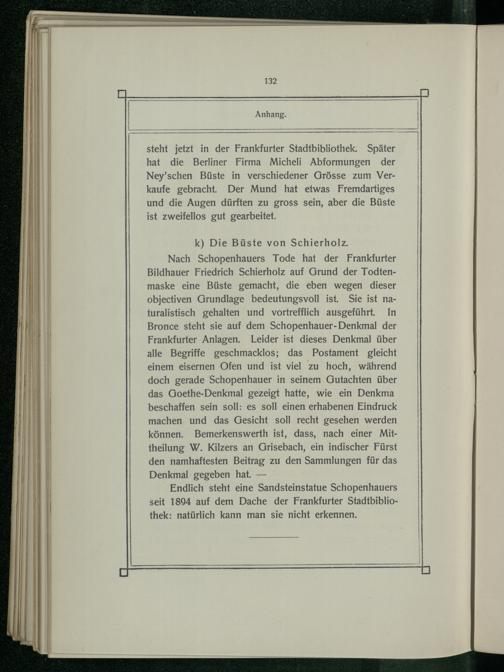 Nach Schopenhauers Tode hat der Frankfurter Bildhauer Friedrich Schierholz auf Grund der Todtenmaske eine Büste gemacht, die eben wegen dieser objectiven Grundlage bedeutungsvoll ist. Sie ist naturalistisch gehalten und vortrefflich ausgeführt. In Bronce steht sie auf dem Schopenhauer-Denkmal der Frankfurter Anlagen. Leider ist dieses Denkmal über alle Begriffe geschmacklos; das Postament gleicht einem eisernen Ofen und ist viel zu hoch, während doch gerade Schopenhauer in seinem Gutachten über das Goethe-Denkmal gezeigt hatte, wie ein Denkma beschaffen sein soll: es soll einen erhabenen Eindruck machen und das Gesicht soll recht gesehen werden können. Bemerkenswerth ist, dass, nach einer Mittheilung W. Kilzers an Grisebach, ein indischer Fürst den namhaftesten Beitrag zu den Sammlungen für das Denkmal gegeben hat.—