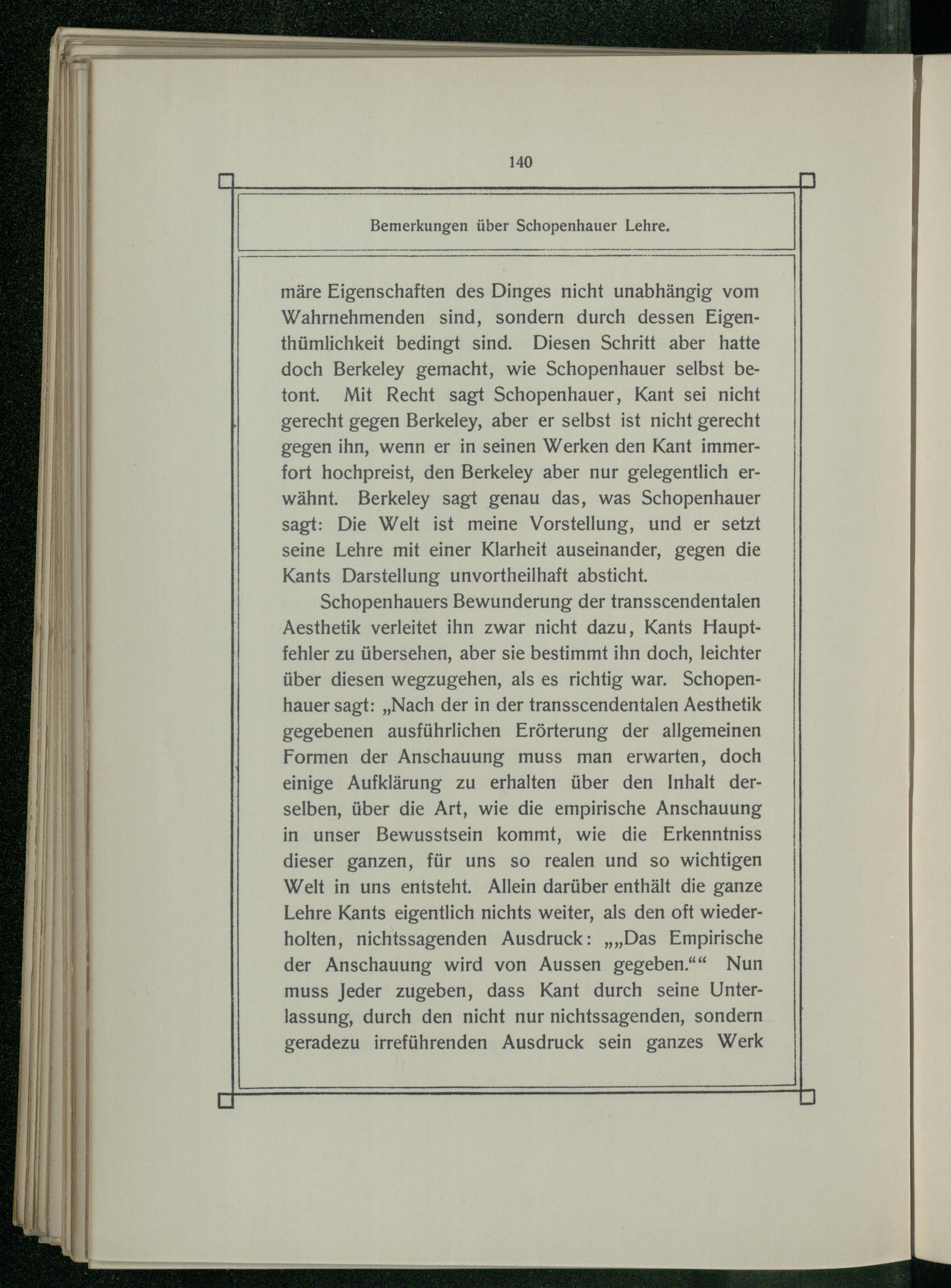märe Eigenschaften des Dinges nicht unabhängig vom Wahrnehmenden sind, sondern durch dessen Eigenthümlichkeit bedingt sind. Diesen Schritt aber hatte doch Berkeley gemacht, wie Schopenhauer selbst betont. Mit Recht sagt Schopenhauer, Kant sei nicht gerecht gegen Berkeley, aber er selbst ist nicht gerecht gegen ihn, wenn er in seinen Werken den Kant immerfort hochpreist, den Berkeley aber nur gelegentlich erwähnt. Berkeley sagt genau das, was Schopenhauer sagt: Die Welt ist meine Vorstellung, und er setzt seine Lehre mit einer Klarheit auseinander, gegen die Kants Darstellung unvortheilhaft absticht. Schopenhauers Bewunderung der transscendentalen Aesthetik verleitet ihn zwar nicht dazu, Kants Hauptfehler zu übersehen, aber sie bestimmt ihn doch, leichter über diesen wegzugehen, als es richtig war. Schopenhauer sagt:„Nach der in der transscendentalen Aesthetik gegebenen ausführlichen Erörterung der allgemeinen Formen der Anschauung muss man erwarten, doch einige Aufklärung zu erhalten über den Inhalt derselben, über die Art, wie die empirische Anschauung in unser Bewusstsein kommt, wie die Erkenntniss dieser ganzen, für uns so realen und so wichtigen Welt in uns entsteht. Allein darüber enthält die ganze Lehre Kants eigentlich nichts weiter, als den oft wiederholten, nichtssagenden Ausdruck:„„Das Empirische der Anschauung wird von Aussen gegeben.“ Nun muss Jeder zugeben, dass Kant durch seine Unterlassung, durch den nicht nur nichtssagenden, sondern geradezu irreführenden Ausdruck sein ganzes Werk