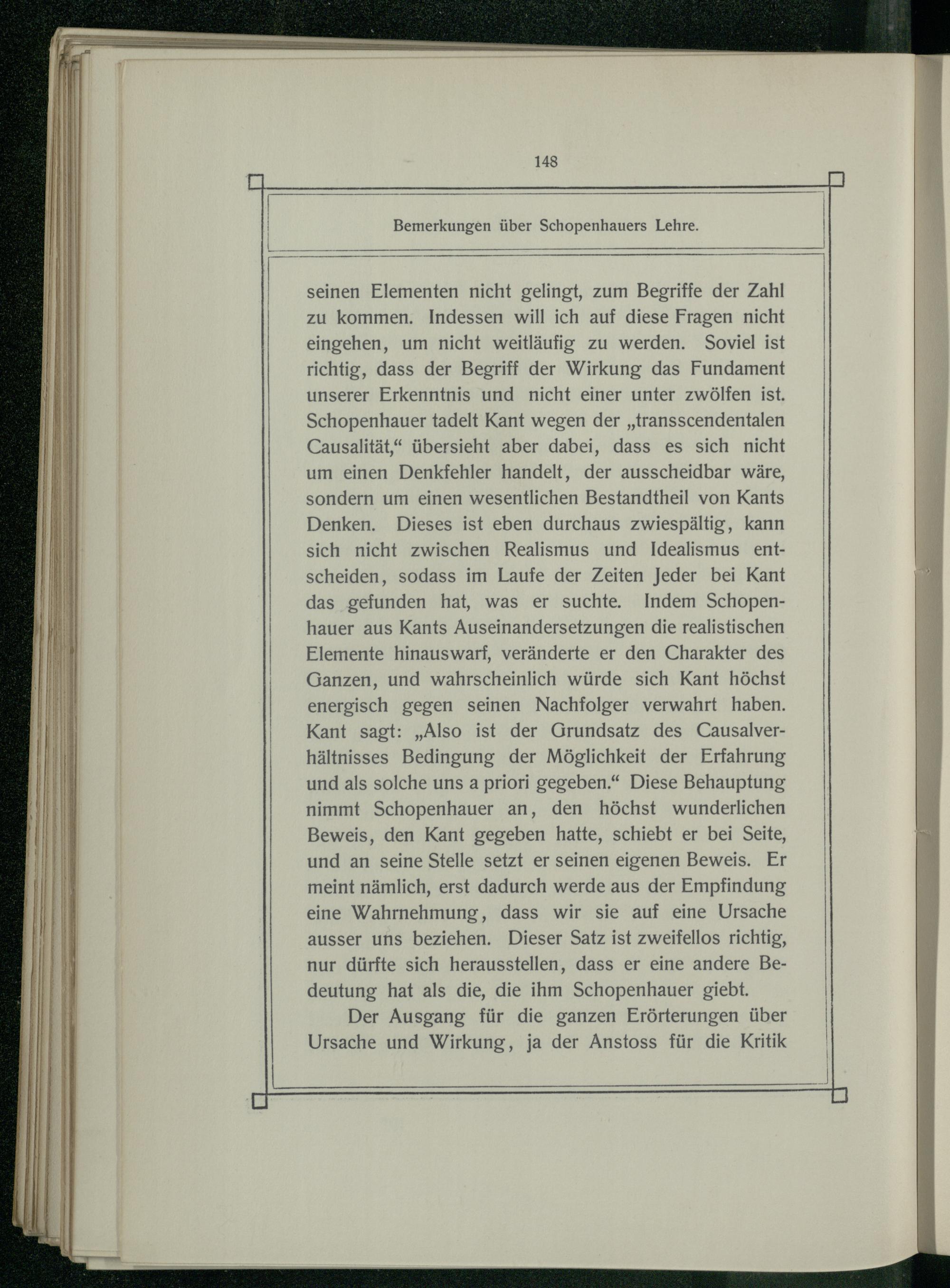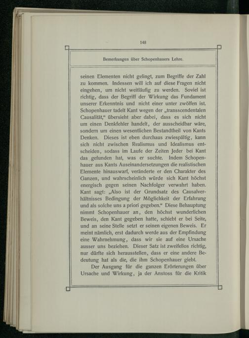 seinen Elementen nicht gelingt, zum Begriffe der Zahl zu kommen. Indessen will ich auf diese Fragen nicht eingehen, um nicht weitläufig zu werden. Soviel ist richtig, dass der Begriff der Wirkung das Fundament unserer Erkenntnis und nicht einer unter zwölfen ist. Schopenhauer tadelt Kant wegen der„transscendentalen Causalität,“ übersieht aber dabei, dass es sich nicht um einen Denkfehler handelt, der ausscheidbar wäre, sondern um einen wesentlichen Bestandtheil von Kants Denken. Dieses ist eben durchaus zwiespältig, kann sich nicht zwischen Realismus und Idealismus entscheiden, sodass im Laufe der Zeiten Jeder bei Kant das gefunden hat, was er suchte. Indem Schopenhauer aus Kants Auseinandersetzungen die realistischen Elemente hinauswarf, veränderte er den Charakter des Ganzen, und wahrscheinlich würde sich Kant höchst energisch gegen seinen Nachfolger verwahrt haben. Kant sagt:„Also ist der Grundsatz des Causalverhältnisses Bedingung der Möglichkeit der Erfahrung und als solche uns a priori gegeben.“ Diese Behauptung nimmt Schopenhauer an, den höchst wunderlichen Beweis, den Kant gegeben hatte, schiebt er bei Seite, und an seine Stelle setzt er seinen eigenen Beweis. Er meint nämlich, erst dadurch werde aus der Empfindung eine Wahrnehmung, dass wir sie auf eine Ursache ausser uns beziehen. Dieser Satz ist zweifellos richtig, nur dürfte sich herausstellen, dass er eine andere Bedeutung hat als die, die ihm Schopenhauer giebt. Der Ausgang für die ganzen Erörterungen über Ursache und Wirkung, ja der Anstoss für die Kritik