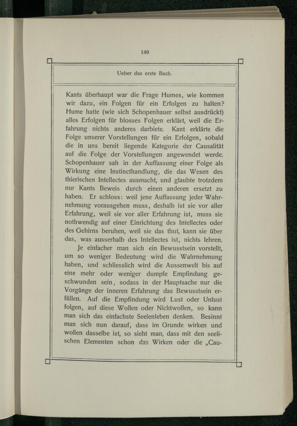 Kants überhaupt war die Frage Humes, wie kommen wir dazu, ein Folgen für ein Erfolgen zu halten? Hume hatte(wie sich Schopenhauer selbst ausdrückt) alles Erfolgen für blosses Folgen erklärt, weil die Erfahrung nichts anderes darbiete. Kant erklärte die Folge unserer Vorstellungen für ein Erfolgen, sobald die in uns bereit liegende Kategorie der Causalität auf die Folge der Vorstellungen angewendet werde. Schopenhauer sah in der Auffassung einer Folge als Wirkung eine Instincethandlung, die das Wesen des thierischen Intellectes ausmacht, und glaubte trotzdem nur Kants Beweis durch einen anderen ersetzt zu haben. Er schloss: weil jene Auffassung jeder Wahrnehmung vorausgehen muss, deshalb ist sie vor aller Erfahrung, weil sie vor aller Erfahrung ist, muss sie nothwendig auf einer Einrichtung des Intellectes oder des Gehirns beruhen, weil sie das thut, kann sie über das, was ausserhalb des Intellectes ist, nichts lehren.