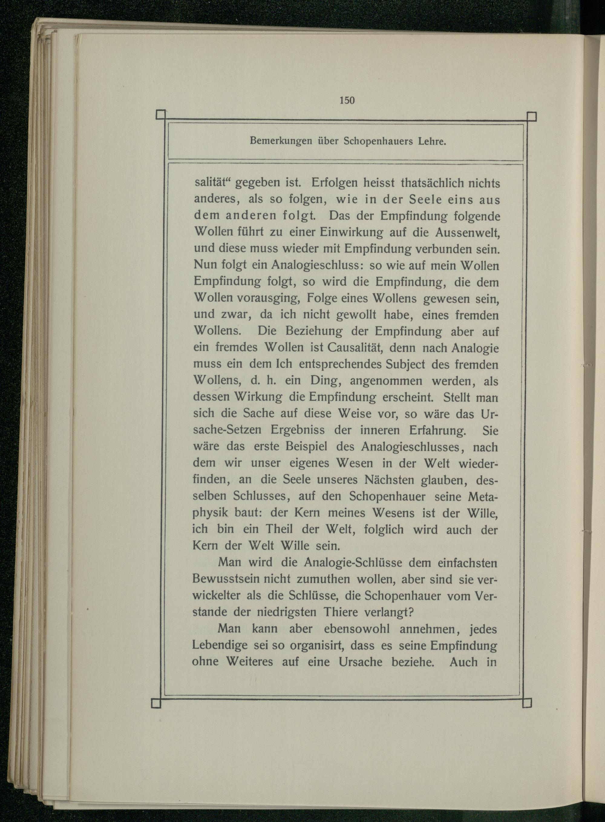 salität“ gegeben ist. Erfolgen heisst thatsächlich nichts anderes, als so folgen, wie in der Seele eins aus dem anderen folgt. Das der Empfindung folgende Wollen führt zu einer Einwirkung auf die Aussenwelt, und diese muss wieder mit Empfindung verbunden sein. Nun folgt ein Analogieschluss: so wie auf mein Wollen Empfindung folgt, so wird die Empfindung, die dem Wollen vorausging, Folge eines Wollens gewesen sein, und zwar, da ich nicht gewollt habe, eines fremden Wollens. Die Beziehung der Empfindung aber auf ein fremdes Wollen ist Causalität, denn nach Analogie muss ein dem Ich entsprechendes Subject des fremden Wollens, d. h. ein Ding, angenommen werden, als dessen Wirkung die Empfindung erscheint. Stellt man sich die Sache auf diese Weise vor, so wäre das Ursache-Setzen Ergebniss der inneren Erfahrung. Sie wäre das erste Beispiel des Analogieschlusses, nach dem wir unser eigenes Wesen in der Welt wieder: finden, an die Seele unseres Nächsten glauben, desselben Schlusses, auf den Schopenhauer seine Metaphysik baut: der Kern meines Wesens ist der Wille, ich bin ein Theil der Welt, folglich wird auch der Kern der Welt Wille sein.