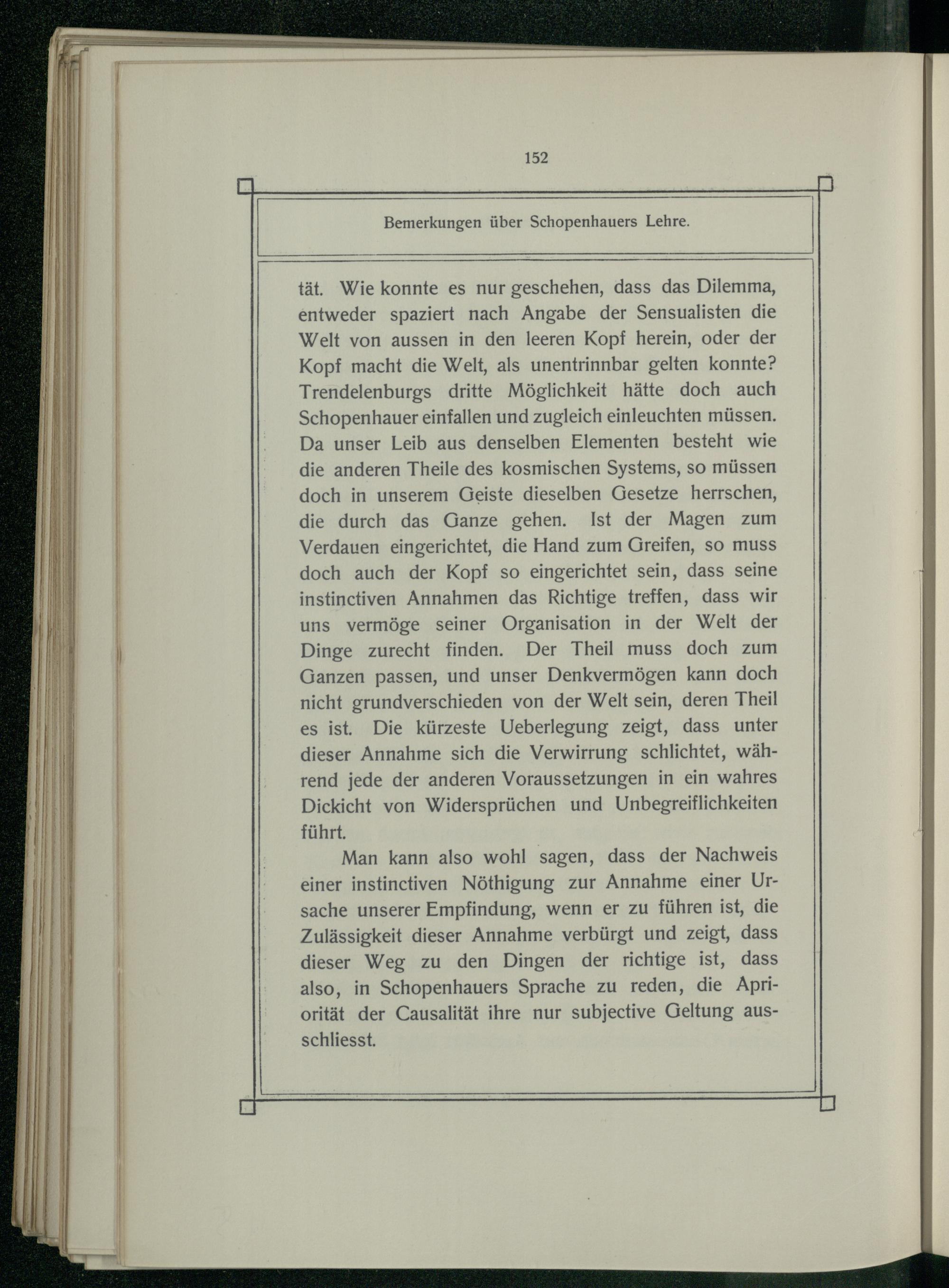 tät. Wie konnte es nur geschehen, dass das Dilemma, entweder spaziert nach Angabe der Sensualisten die Welt von aussen in den leeren Kopf herein, oder der Kopf macht die Welt, als unentrinnbar gelten konnte? Trendelenburgs dritte Möglichkeit hätte doch auch Schopenhauer einfallen und zugleich einleuchten müssen. Da unser Leib aus denselben Elementen besteht wie die anderen Theile des kosmischen Systems, so müssen doch in unserem Geiste dieselben Gesetze herrschen, die durch das Ganze gehen. Ist der Magen zum Verdauen eingerichtet, die Hand zum Greifen, so muss doch auch der Kopf so eingerichtet sein, dass seine instinctiven Annahmen das Richtige treffen, dass wir uns vermöge seiner Organisation in der Welt der Dinge zurecht finden. Der Theil muss doch zum Ganzen passen, und unser Denkvermögen kann doch nicht grundverschieden von der Welt sein, deren Theil es ist. Die kürzeste Ueberlegung zeigt, dass unter dieser Annahme sich die Verwirrung schlichtet, während jede der anderen Voraussetzungen in ein wahres Dickicht von Widersprüchen und Unbegreiflichkeiten führt.