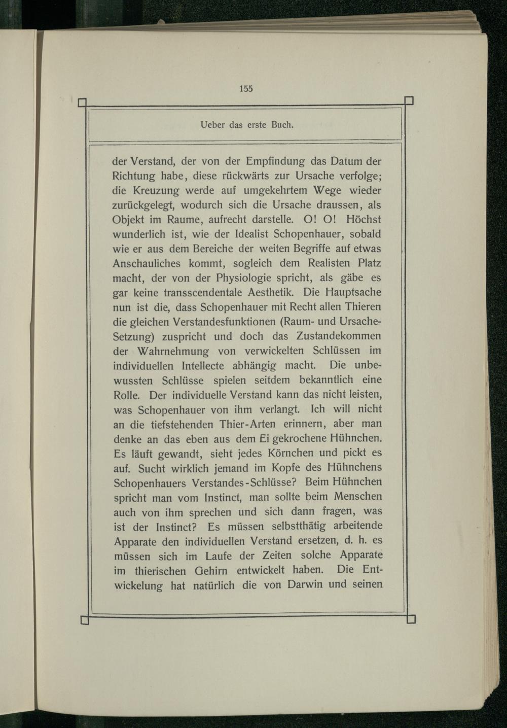 der Verstand, der von der Empfindung das Datum der Richtung habe, diese rückwärts zur Ursache verfolge; die Kreuzung werde auf umgekehrtem Wege wieder zurückgelegt, wodurch sich die Ursache draussen, als Objekt im Raume, aufrecht darstelle. O! O! Höchst wunderlich ist, wie der Idealist Schopenhauer, sobald wie er aus dem Bereiche der weiten Begriffe auf etwas Anschauliches kommt, sogleich dem Realisten Platz macht, der von der Physiologie spricht, als gäbe es gar keine transscendentale Aesthetik. Die Hauptsache nun ist die, dass Schopenhauer mit Recht allen Thieren die gleichen Verstandesfunktionen(Raum- und UrsacheSetzung) zuspricht und doch das Zustandekommen der Wahrnehmung von verwickelten Schlüssen im individuellen Intellecte abhängig macht. Die unbewussten Schlüsse spielen seitdem bekanntlich eine Rolle. Der individuelle Verstand kann das nicht leisten, was Schopenhauer von ihm verlangt. Ich will nicht an die tiefstehenden Thier-Arten erinnern, aber man denke an das eben aus dem Ei gekrochene Hühnchen. Es läuft gewandt, sieht jedes Körnchen und pickt es auf. Sucht wirklich jemand im Kopfe des Hühnchens Schopenhauers Verstandes-Schlüsse? Beim Hühnchen spricht man vom Instinct, man sollte beim Menschen auch von ihm sprechen und sich dann fragen, was ist der Instinct? Es müssen selbstthätig arbeitende Apparate den individuellen Verstand ersetzen, d. h. es müssen sich im Laufe der Zeiten solche Apparate im thierischen Gehirn entwickelt haben. Die Entwickelung hat natürlich die von Darwin und seinen
