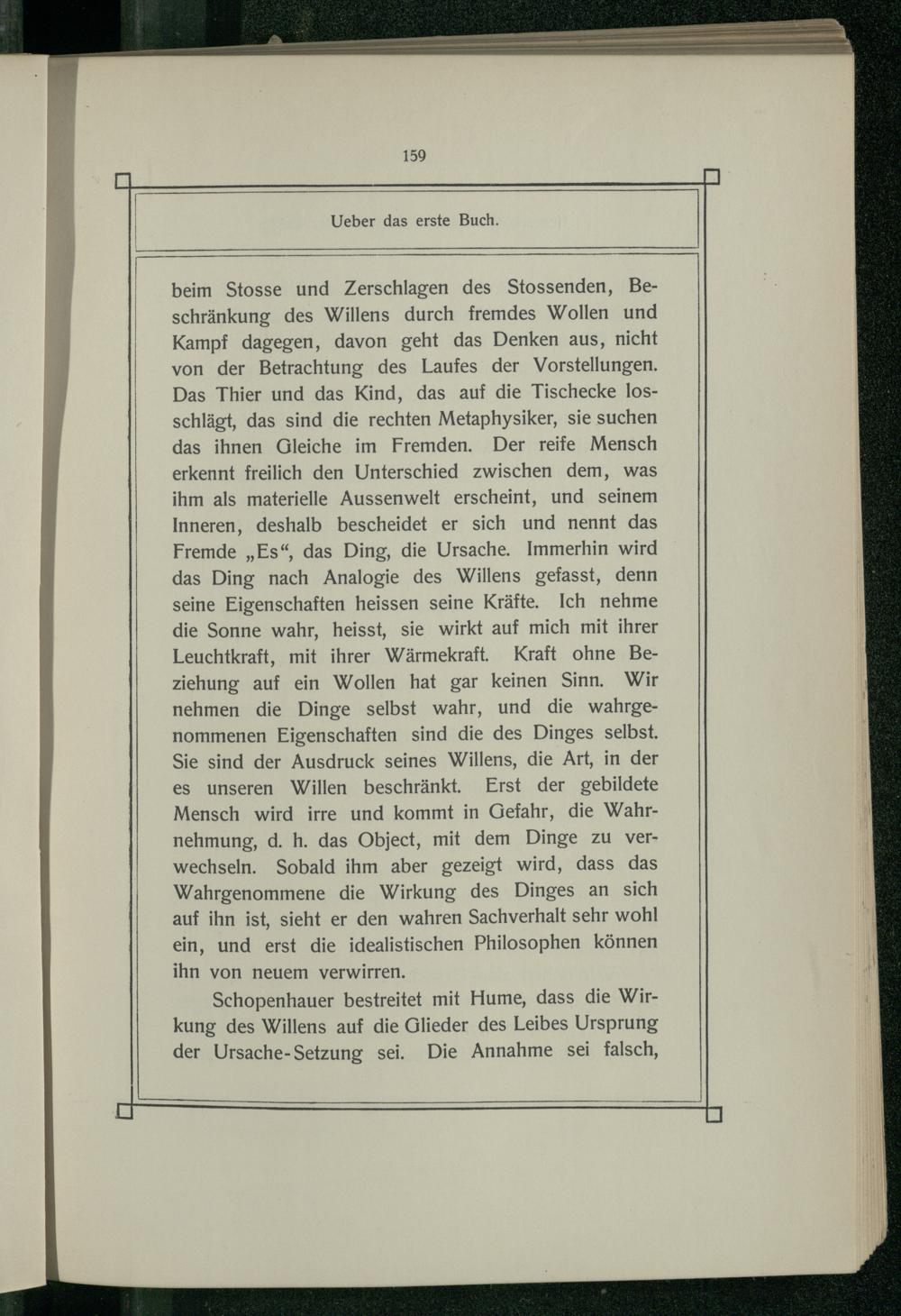 beim Stosse und Zerschlagen des Stossenden, Beschränkung des Willens durch fremdes Wollen und Kampf dagegen, davon geht das Denken aus, nicht von der Betrachtung des Laufes der Vorstellungen. Das Thier und das Kind, das auf die Tischecke losschlägt, das sind die rechten Metaphysiker, sie suchen das ihnen Gleiche im Fremden. Der reife Mensch erkennt freilich den Unterschied zwischen dem, was ihm als materielle Aussenwelt erscheint, und seinem Inneren, deshalb bescheidet er sich und nennt das Fremde„Es“, das Ding, die Ursache. Immerhin wird das Ding nach Analogie des Willens gefasst, denn seine Eigenschaften heissen seine Kräfte. Ich nehme die Sonne wahr, heisst, sie wirkt auf mich mit ihrer Leuchtkraft, mit ihrer Wärmekraft. Kraft ohne Beziehung auf ein Wollen hat gar keinen Sinn. Wir nehmen die Dinge selbst wahr, und die wahrgenommenen Eigenschaften sind die des Dinges selbst. Sie sind der Ausdruck seines Willens, die Art, in der es unseren Willen beschränkt. Erst der gebildete Mensch wird irre und kommt in Gefahr, die Wahrnehmung, d. h. das Object, mit dem Dinge zu verwechseln. Sobald ihm aber gezeigt wird, dass das Wahrgenommene die Wirkung des Dinges an sich auf ihn ist, sieht er den wahren Sachverhalt sehr wohl ein, und erst die idealistischen Philosophen können