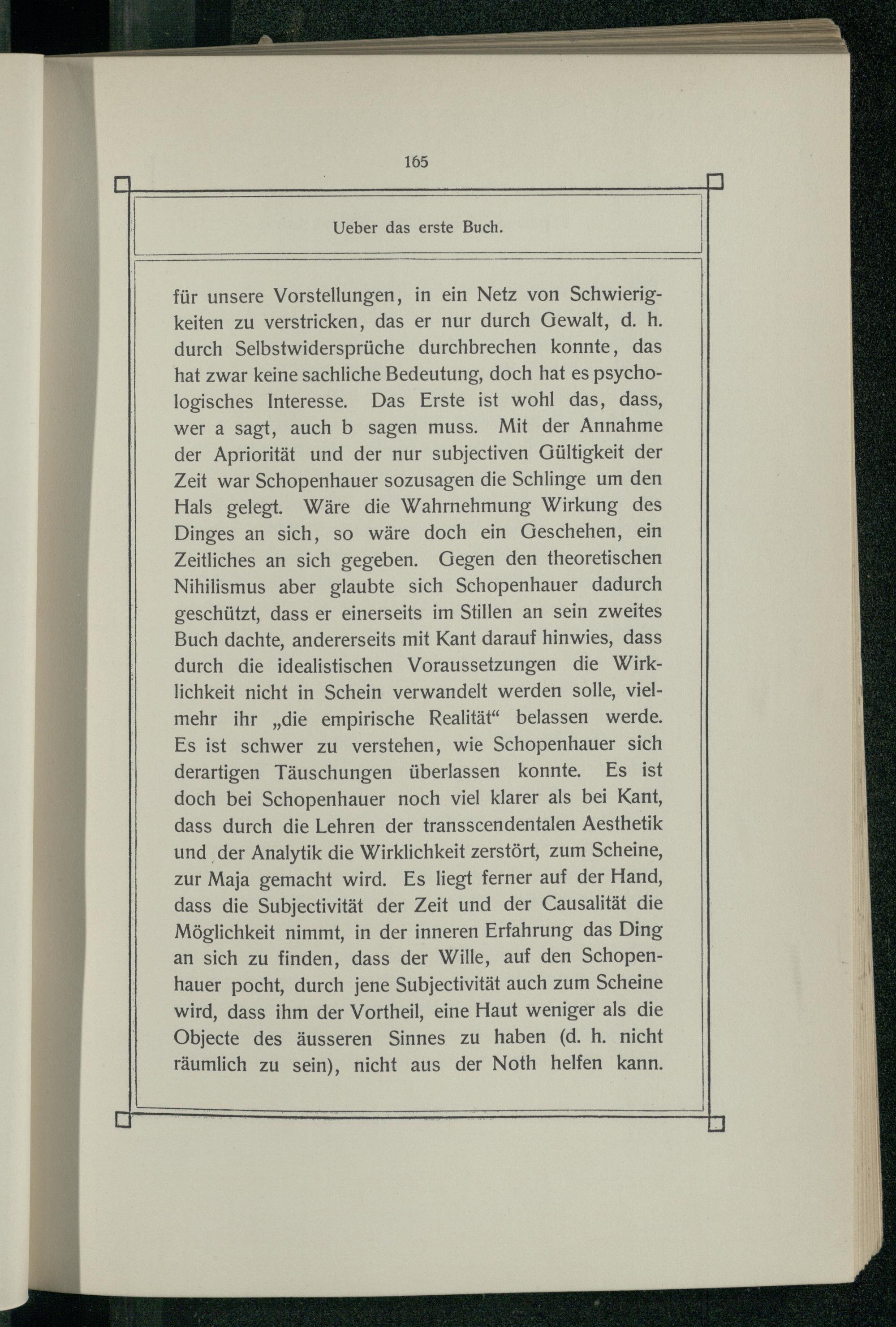 für unsere Vorstellungen, in ein Netz von Schwierigkeiten zu verstricken, das er nur durch Gewalt, d. h. durch Selbstwidersprüche durchbrechen konnte, das hat zwar keine sachliche Bedeutung, doch hat es psychologisches Interesse. Das Erste ist wohl das, dass, wer a sagt, auch b sagen muss. Mit der Annahme der Apriorität und der nur subjectiven Gültigkeit der Zeit war Schopenhauer sozusagen die Schlinge um den Hals gelegt. Wäre die Wahrnehmung Wirkung des Dinges an sich, so wäre doch ein Geschehen, ein Zeitliches an sich gegeben. Gegen den theoretischen Nihilismus aber glaubte sich Schopenhauer dadurch geschützt, dass er einerseits im Stillen an sein zweites Buch dachte, andererseits mit Kant darauf hinwies, dass durch die idealistischen Voraussetzungen die Wirklichkeit nicht in Schein verwandelt werden solle, vielmehr ihr„die empirische Realität“ belassen werde. Es ist schwer zu verstehen, wie Schopenhauer sich derartigen Täuschungen überlassen konnte. Es ist doch bei Schopenhauer noch viel klarer als bei Kant, dass durch die Lehren der transscendentalen Aesthetik und der Analytik die Wirklichkeit zerstört, zum Scheine, zur Maja gemacht wird. Es liegt ferner auf der Hand, dass die Subjectivität der Zeit und der Causalität die Möglichkeit nimmt, in der inneren Erfahrung das Ding an sich zu finden, dass der Wille, auf den Schopenhauer pocht, durch jene Subjectivität auch zum Scheine wird, dass ihm der Vortheil, eine Haut weniger als die Objecte des äusseren Sinnes zu haben(d. h. nicht räumlich zu sein), nicht aus der Noth helfen kann.