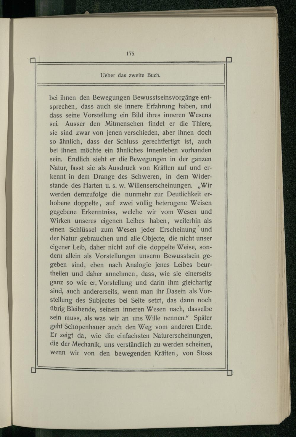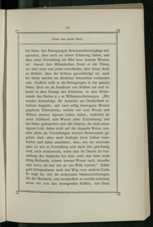 bei ihnen den Bewegungen Bewusstseinsvorgänge entsprechen, dass auch sie innere Erfahrung haben, und dass seine Vorstellung ein Bild ihres inneren Wesens sei. Ausser den Mitmenschen findet er die Thiere, sie sind zwar von jenen verschieden, aber ihnen doch so ähnlich, dass der Schluss gerechtfertigt ist, auch bei ihnen möchte ein ähnliches Innenleben vorhanden sein. Endlich sieht er die Bewegungen in der ganzen Natur, fasst sie als Ausdruck von Kräften auf und erkennt in dem Drange des Schweren, in dem Widerstande des Harten u. s. w. Willenserscheinungen.„Wir werden demzufolge die nunmehr zur Deutlichkeit erhobene doppelte, auf zwei völlig heterogene Weisen gegebene Erkenntniss, welche wir vom Wesen und Wirken unseres eigenen Leibes haben, weiterhin als einen Schlüssel zum Wesen jeder Erscheinung und der Natur gebrauchen und alle Objecte, die nicht unser eigener Leib, daher nicht auf die doppelte Weise, sondern allein als Vorstellungen unserm Bewusstsein gegeben sind, eben nach Analogie jenes Leibes beurtheilen und daher annehmen, dass, wie sie einerseits ganz so wie er, Vorstellung und darin ihm gleichartig sind, auch andererseits, wenn man ihr Dasein als Vorstellung des Subjectes bei Seite setzt, das dann noch übrig Bleibende, seinem inneren Wesen nach, dasselbe sein muss, als was wir an uns Wille nennen.“ Später geht Schopenhauer auch den Weg vom anderen Ende. Er zeigt da, wie die einfachsten Naturerscheinungen, die der Mechanik, uns verständlich zu werden scheinen, wenn wir von den bewegenden Kräften, von Stoss