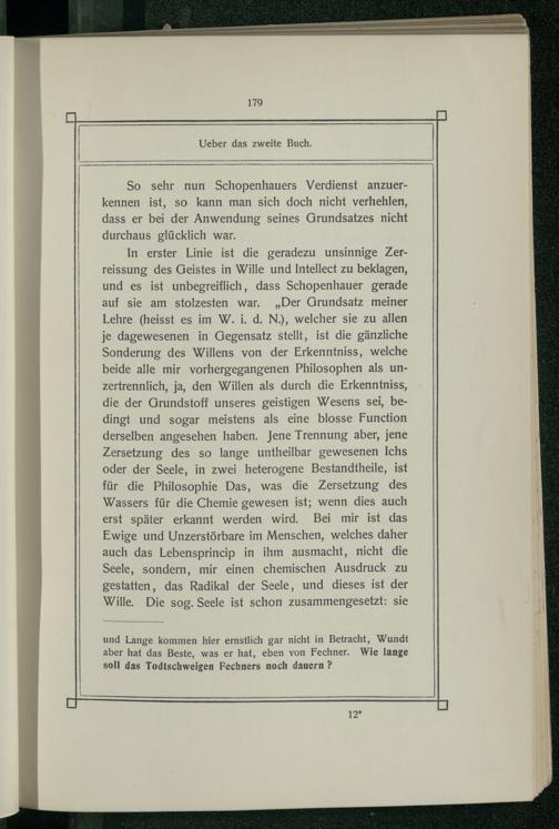 In erster Linie ist die geradezu unsinnige Zerreissung des Geistes in Wille und Intellect zu beklagen, und es ist unbegreiflich, dass Schopenhauer gerade auf sie am stolzesten war.„Der Grundsatz meiner Lehre(heisst es im W. i. d. N.), welcher sie zu allen je dagewesenen in Gegensatz Stellt, ist die gänzliche Sonderung des Willens von der Erkenntniss, welche beide alle mir vorhergegangenen Philosophen als unzertrennlich, ja, den Willen als durch die Erkenntniss, die der Grundstoff unseres geistigen Wesens sei, bedingt und sogar meistens als eine blosse Function derselben angesehen haben. Jene Trennung aber, jene Zersetzung des so lange untheilbar gewesenen Ichs oder der Seele, in zwei heterogene Bestandtheile, ist für die Philosophie Das, was die Zersetzung des Wassers für die Chemie gewesen ist; wenn dies auch erst später erkannt werden wird. Bei mir ist das Ewige und Unzerstörbare im Menschen, welches daher auch das Lebensprincip in ihm ausmacht, nicht die Seele, sondern, mir einen chemischen Ausdruck zu gestatten, das Radikal der Seele, und dieses ist der Wille. Die sog. Seele ist schon zusammengesetzt: sie