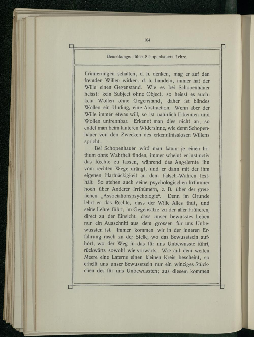 Bei Schopenhauer wird man kaum je einen Irrthum ohne Wahrheit finden, immer scheint er instinctiv das Rechte zu fassen, während das Angelernte ihn vom rechten Wege drängt, und er dann mit der ihm eigenen Hartnäckigkeit an dem Falsch-Wahren festhält. So stehen auch seine psychologischen Irrthümer hoch über Anderer Irrthümern, z. B. über der greulichen„Associationspsychologie“. Denn im Grunde lehrt er das Rechte, dass der Wille Alles thut, und seine Lehre führt, im Gegensatze zu der aller Früheren, direct zu der Einsicht, dass unser bewusstes Leben nur ein Ausschnitt aus dem grossen für uns Unbewussten ist. Immer kommen wir in der inneren Erfahrung rasch zu der Stelle, wo das Bewusstsein aufhört, wo der Weg in das für uns Unbewusste führt, rückwärts sowohl wie vorwärts. Wie auf dem weiten Meere eine Laterne einen kleinen Kreis bescheint, so erhellt uns unser Bewusstsein nur ein winziges Stückchen des für uns Unbewussten; aus diesem kommen