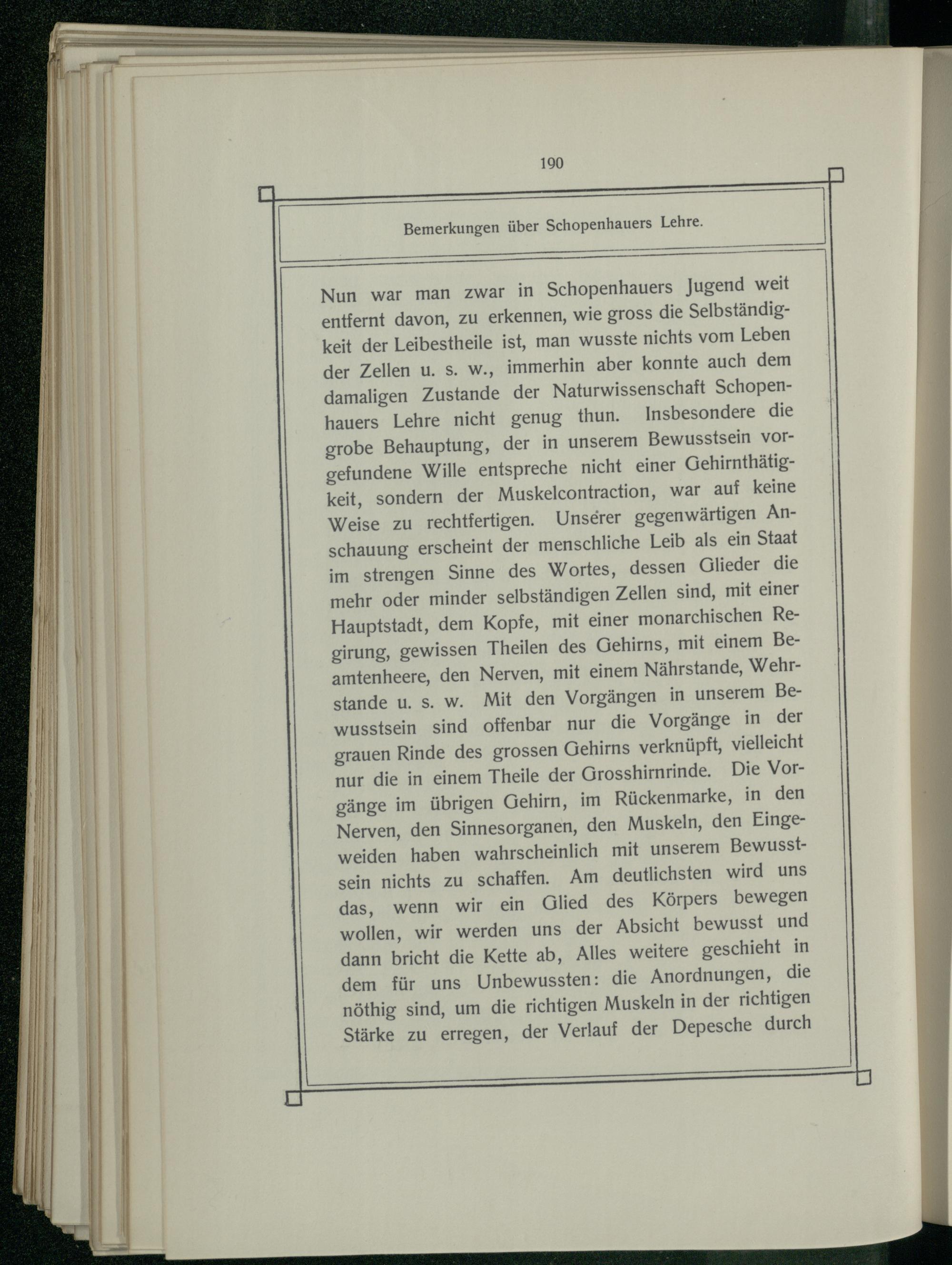 Nun war man zwar in Schopenhauers Jugend weit entfernt davon, zu erkennen, wie gross die Selbständigkeit der Leibestheile ist, man wusste nichts vom Leben der Zellen u. s. w., immerhin aber konnte auch dem damaligen Zustande der Naturwissenschaft Schopenhauers Lehre nicht genug thun. Insbesondere die grobe Behauptung, der in unserem Bewusstsein vorgefundene Wille entspreche nicht einer Gehirnthätigkeit, sondern der Muskelcontraction, war auf keine Weise zu rechtfertigen. Unserer gegenwärtigen Anschauung erscheint der menschliche Leib als ein Staat im strengen Sinne des Wortes, dessen Glieder die mehr oder minder selbständigen Zellen sind, mit einer Hauptstadt, dem Kopfe, mit einer monarchischen Regirung, gewissen Theilen des Gehirns, mit einem Beamtenheere, den Nerven, mit einem Nährstande, Wehrstande u. s. w. Mit den Vorgängen in unserem Bewusstsein sind offenbar nur die Vorgänge in. der grauen Rinde des grossen Gehirns verknüpft, vielleicht nur die in einem Theile der Grosshirnrinde. Die Vorgänge im übrigen Gehirn, im Rückenmarke, in den Nerven, den Sinnesorganen, den Muskeln, den Eingeweiden haben wahrscheinlich mit unserem Bewusstsein nichts zu schaffen. Am deutlichsten wird uns das, wenn wir ein Glied des Körpers bewegen wollen, wir werden uns der Absicht bewusst und dann bricht die Kette ab, Alles weitere geschieht in dem für uns Unbewussten: die Anordnungen, die nöthig sind, um die richtigen Muskeln in der richtigen Stärke zu erregen, der Verlauf der Depesche durch