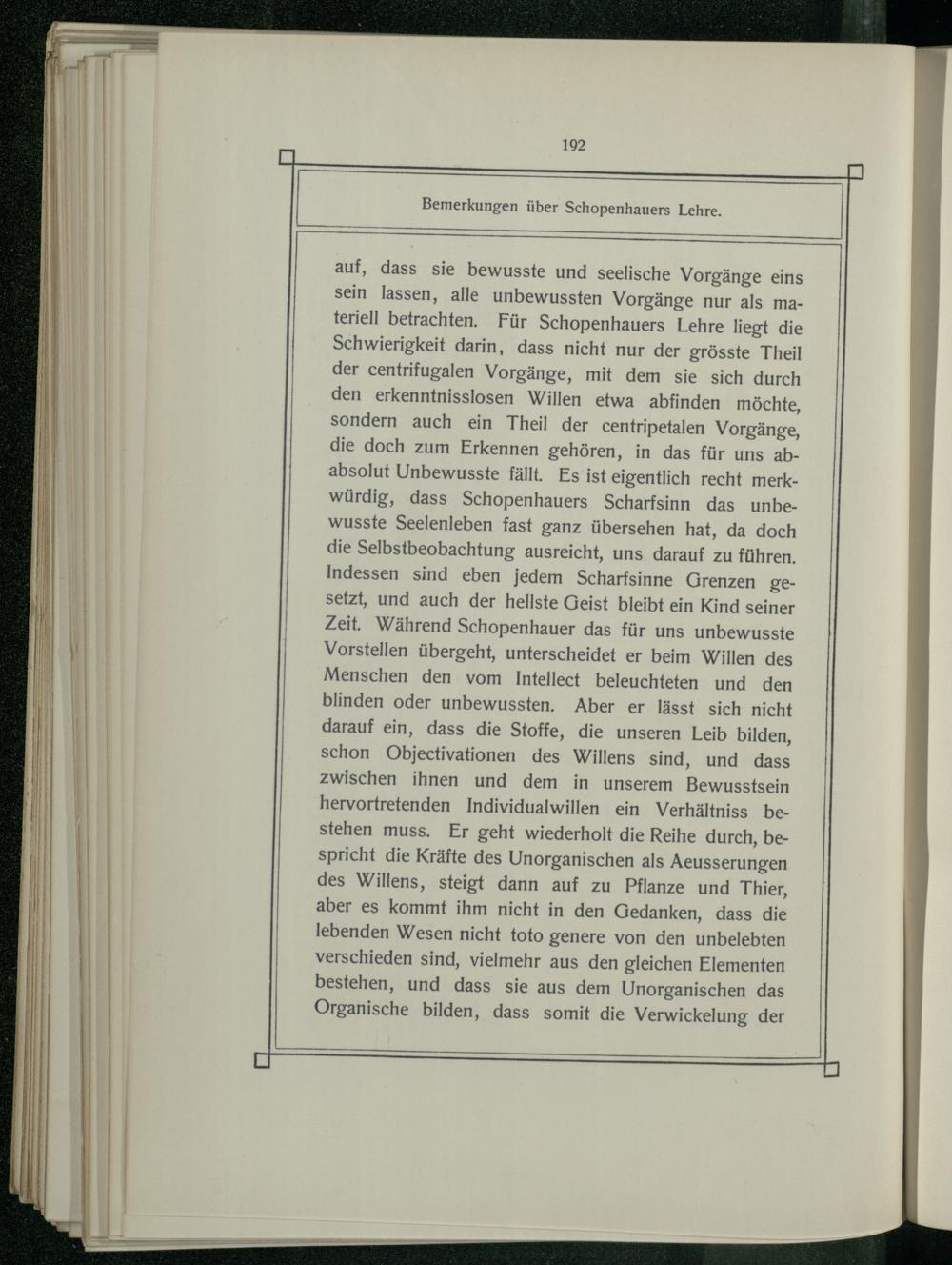 auf, dass sie bewusste und seelische Vorgänge eins sein lassen, alle unbewussten Vorgänge nur als materiell betrachten. Für Schopenhauers Lehre liegt die Schwierigkeit darin, dass nicht nur der grösste Theil der centrifugalen Vorgänge, mit dem sie sich durch den erkenntnisslosen Willen etwa abfinden möchte, sondern auch ein Theil der centripetalen Vorgänge, die doch zum Erkennen gehören, in das für uns ababsolut Unbewusste fällt. Es ist eigentlich recht merkwürdig, dass Schopenhauers Scharfsinn das unbewusste Seelenleben fast ganz übersehen hat, da doch die Selbstbeobachtung ausreicht, uns darauf zu führen. Indessen sind eben jedem Scharfsinne Grenzen gesetzt, und auch der hellste Geist bleibt ein Kind seiner Zeit. Während Schopenhauer das für uns unbewusste Vorstellen übergeht, unterscheidet er beim Willen des Menschen den vom Intellect beleuchteten und den blinden oder unbewussten. Aber er lässt sich nicht darauf ein, dass die Stoffe, die unseren Leib bilden, schon Objectivationen des Willens sind, und dass zwischen ihnen und dem in unserem Bewusstsein hervortretenden Individualwillen ein Verhältniss bestehen muss. Er geht wiederholt die Reihe durch, bespricht die Kräfte des Unorganischen als Aeusserungen des Willens, steigt dann auf zu Pflanze und Thier, aber es kommt ihm nicht in den Gedanken, dass die lebenden Wesen nicht toto genere von den unbelebten verschieden sind, vielmehr aus den gleichen Elementen bestehen, und dass sie aus dem Unorganischen das Organische bilden, dass somit die Verwickelung der