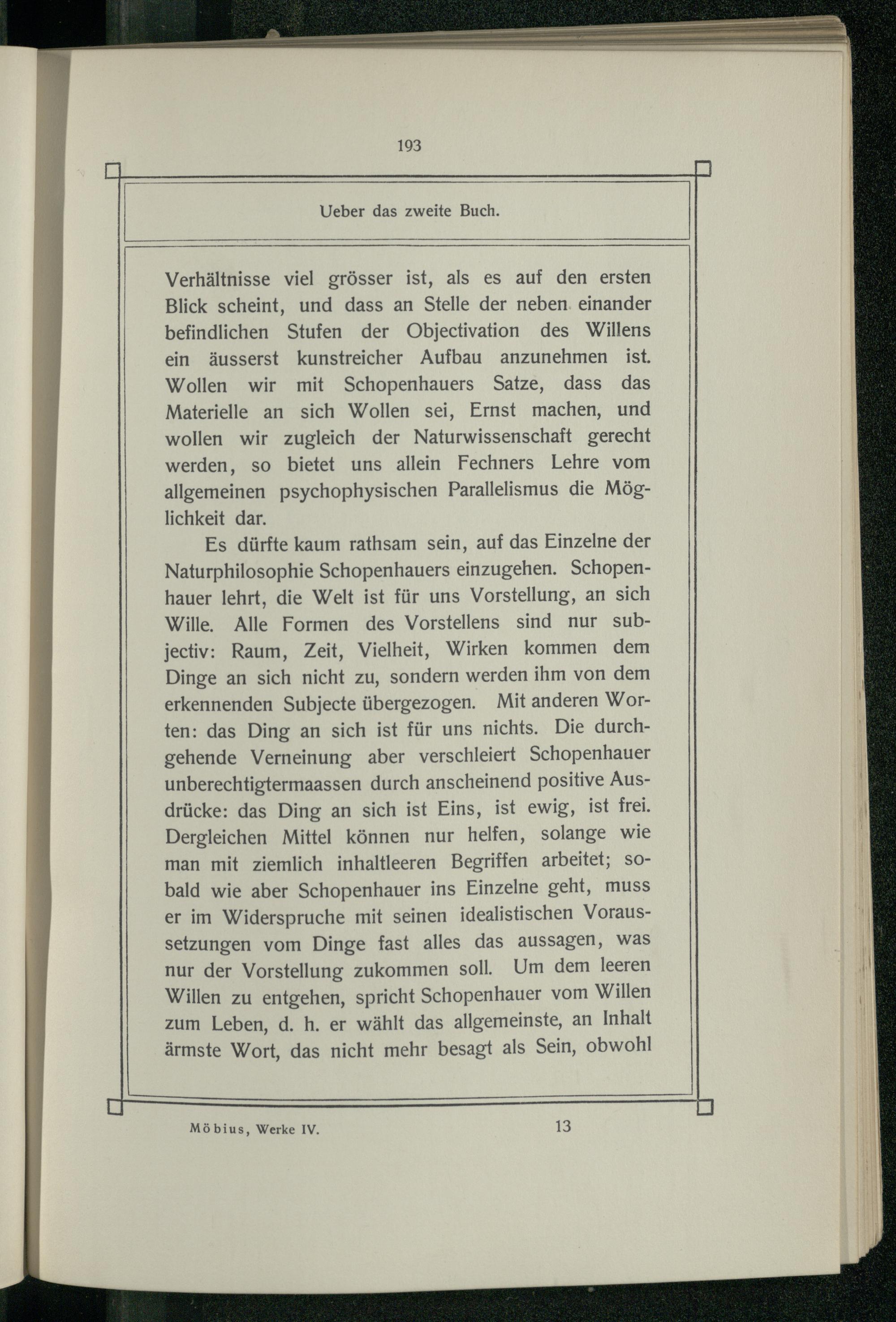 Verhältnisse viel grösser ist, als es auf den ersten Blick scheint, und dass an Stelle der neben. einander befindlichen Stufen der Objectivation des Willens ein äusserst kunstreicher Aufbau anzunehmen ist. Wollen wir mit Schopenhauers Satze, dass das Materielle an sich Wollen sei, Ernst machen, und wollen wir zugleich der Naturwissenschaft gerecht werden, so bietet uns allein Fechners Lehre vom allgemeinen psychophysischen Parallelismus die Möglichkeit dar.