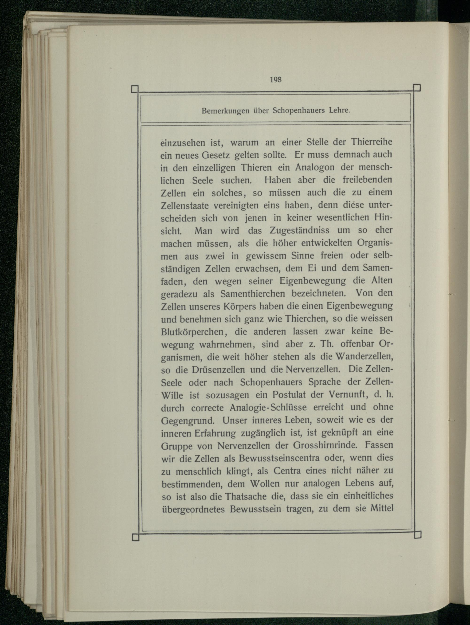 einzusehen ist, warum an einer Stelle der Thierreihe ein neues Gesetz gelten sollte. Er muss demnach auch in den einzelligen Thieren ein Analogon der menschlichen ‚Seele suchen. Haben aber die freilebenden Zellen ein solches, so müssen auch die zu einem Zellenstaate vereinigten eins haben, denn diese unterscheiden sich von jenen in keiner wesentlichen Hinsicht. Man wird das Zugeständniss um so eher machen müssen, als die höher entwickelten Organismen aus zwei in gewissem Sinne freien oder selbständigen Zellen erwachsen, dem Ei und dem Samenfaden, den wegen seiner Eigenbewegung die Alten geradezu als Samenthierchen bezeichneten. Von den Zellen unseres Körpers haben die einen Eigenbewegung und benehmen sich ganz wie Thierchen, so die weissen Blutkörperchen, die anderen lassen zwar keine Bewegung wahrnehmen, sind aber z. Th. offenbar Organismen, die weit höher stehen als die Wanderzellen, so die Drüsenzellen und die Nervenzellen. Die ZellenSeele oder nach Schopenhauers Sprache der ZellenWille ist sozusagen ein Postulat der Vernunft, d. h. durch correcte Analogie-Schlüsse erreicht und ohne Gegengrund. Unser inneres Leben, soweit wie es der inneren Erfahrung zugänglich ist, ist geknüpft an eine Gruppe von Nervenzellen der Grosshirnrinde. Fassen wir die Zellen als Bewusstseinscentra oder, wenn dies zu menschlich klingt, als Centra eines nicht näher zu bestimmenden, dem Wollen nur analogen Lebens auf, so ist also die Thatsache die, dass sie ein einheitliches übergeordnetes Bewusstsein tragen, zu dem sie Mittel